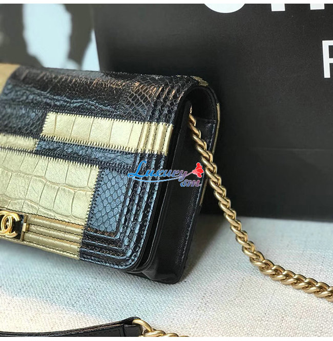 [스페셜오더]CHANEL-A81969 샤넬 골드/블랙 크로커다일/파이톤 카프스킨 골드메탈 보이 샤넬 체인 지갑