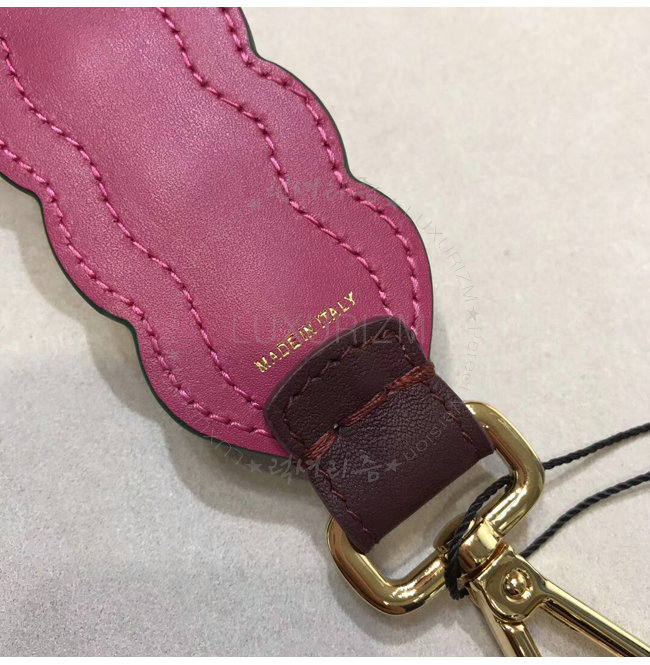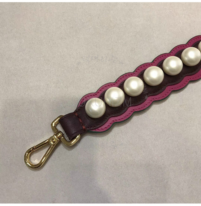 핑크와 버건디 컬러의 가죽 소재. 한 줄의 화이트 컬러 매크로 펄 장식. 골드 피니싱 메탈 장식.