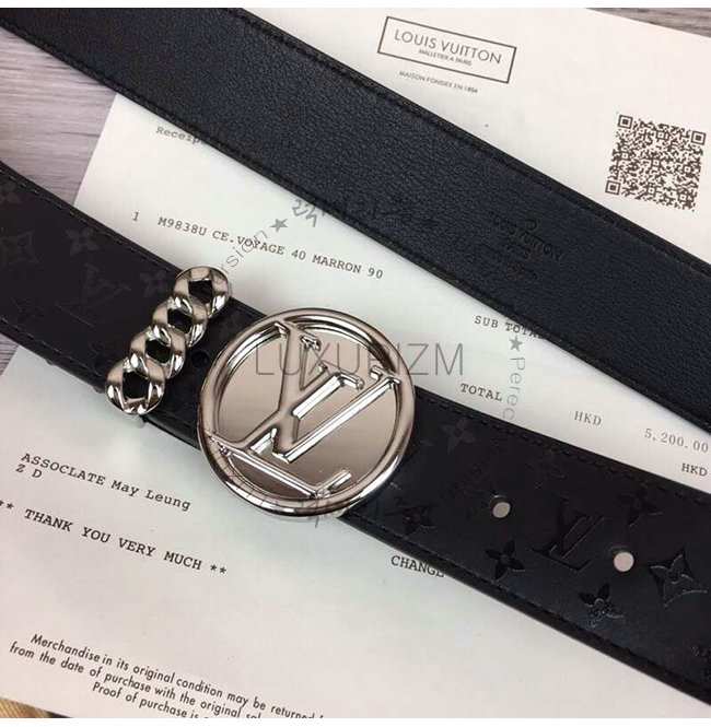 모노그램 송아지 가죽 벨트 송아지 가죽 안감 실버 LV 원형 버클 실버 체인 디자인.