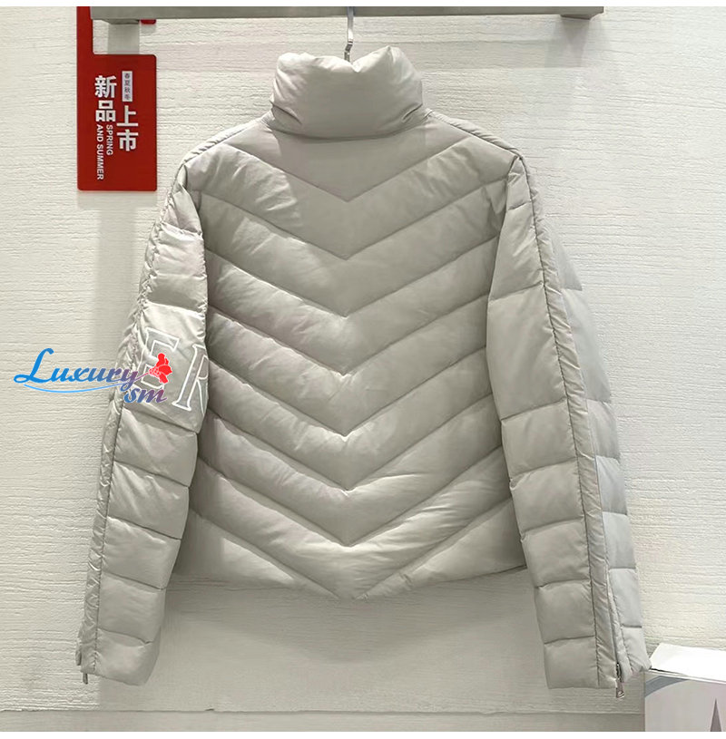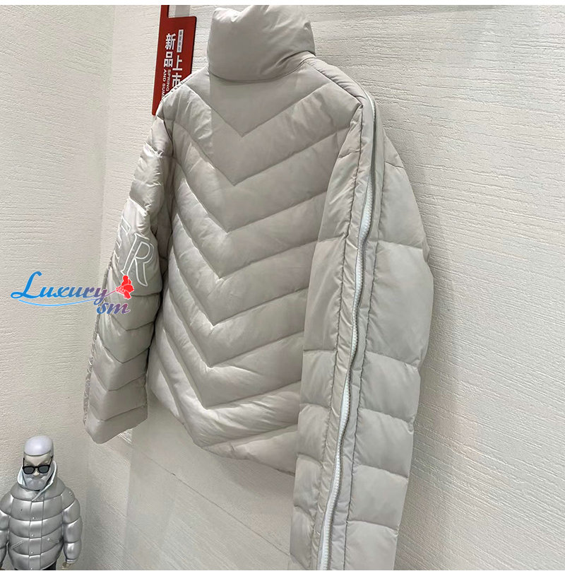 다운 재킷은 쉐브론 퀼팅으로 생동감을 불어넣었