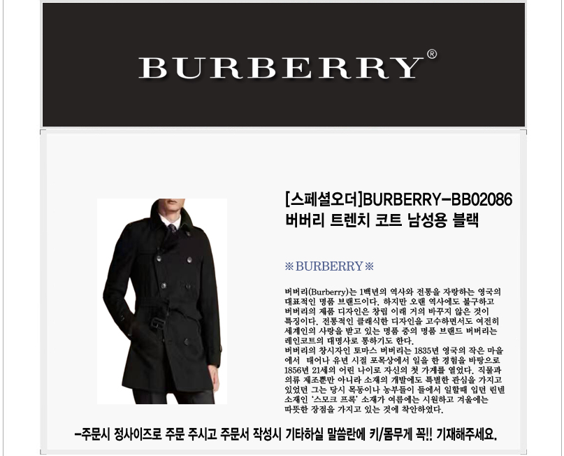 [스페셜오더]BURBERRY-BB02086 버버리 트렌치 코트 남성용 블랙