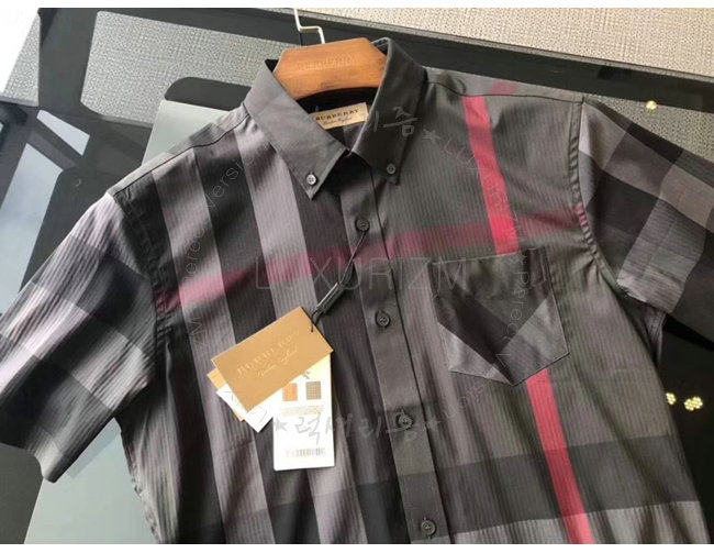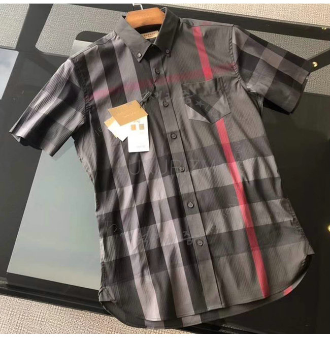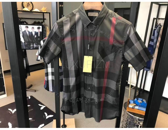 [스페셜오더]BURBERRY-40458371 버버리 쇼트 슬리브 체크 스트레치 차콜 코튼 블렌드 셔츠