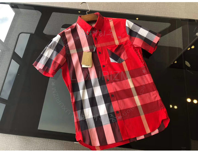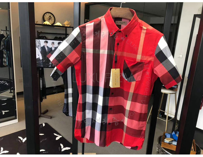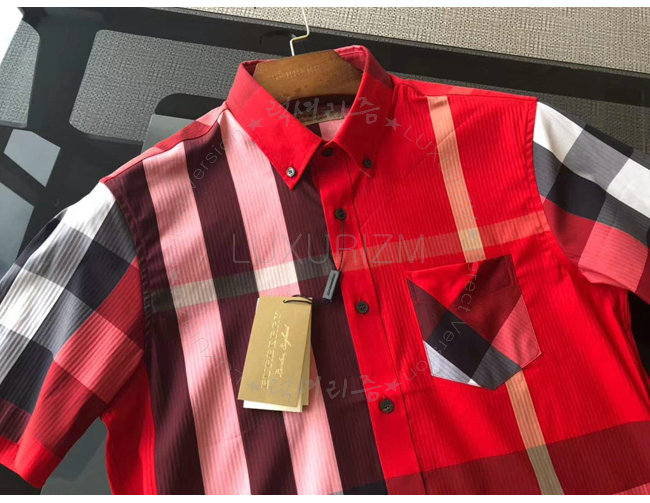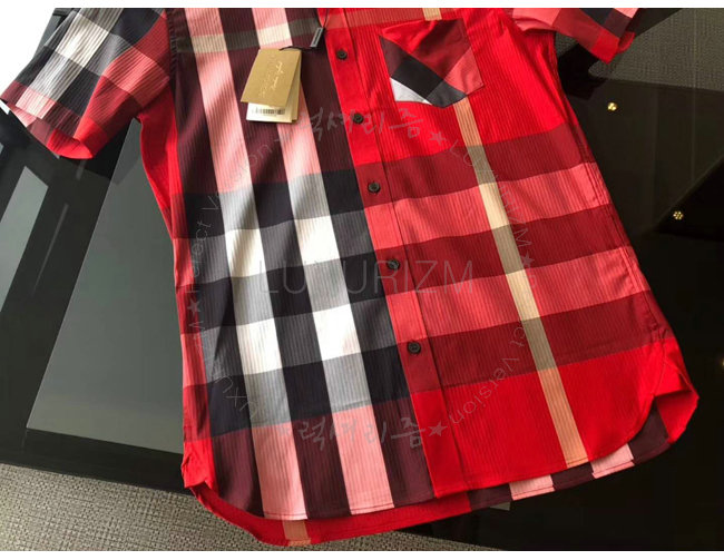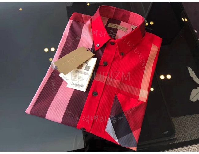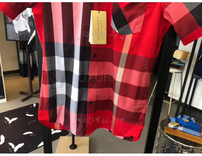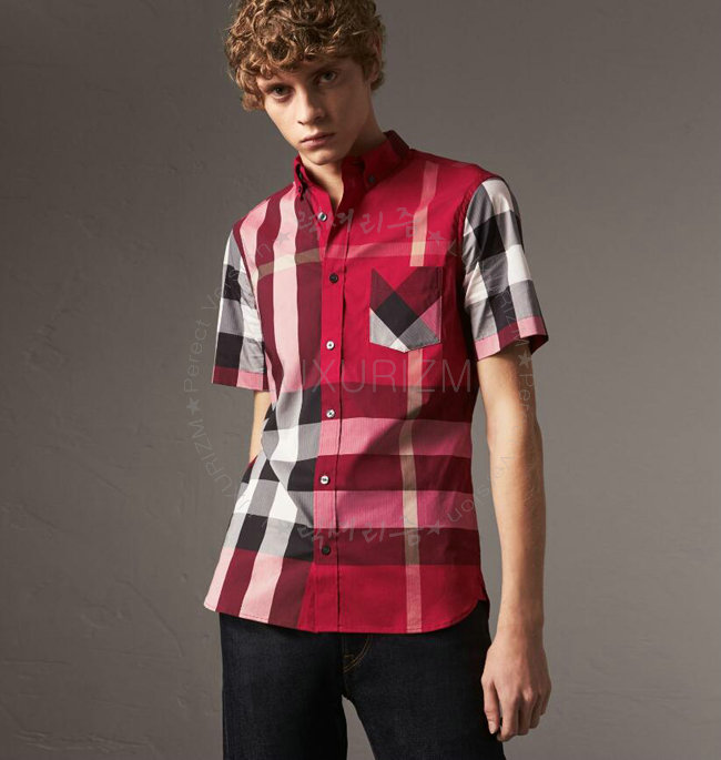 [스페셜오더]BURBERRY-40458371 버버리 쇼트 슬리브 체크 스트레치 레드 코튼 블렌드 셔츠