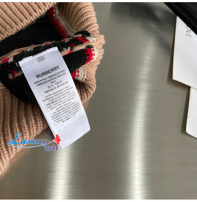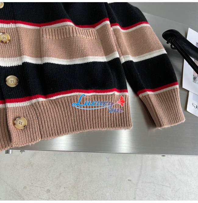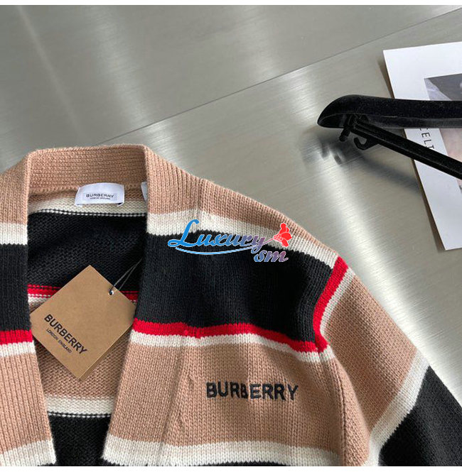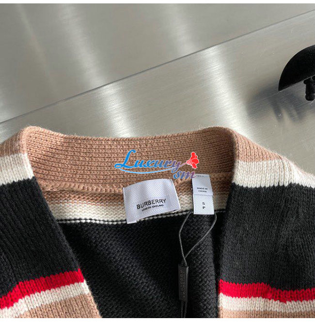 BURBERRY-80502611 버버리 카멜 엠브로이더리 로고 스트라이프 카디건