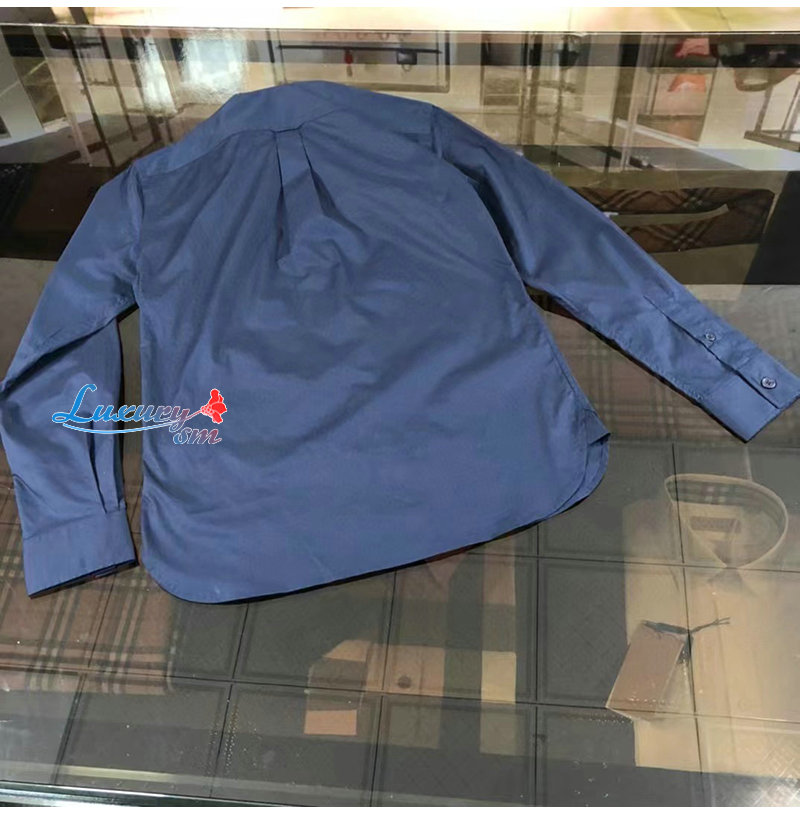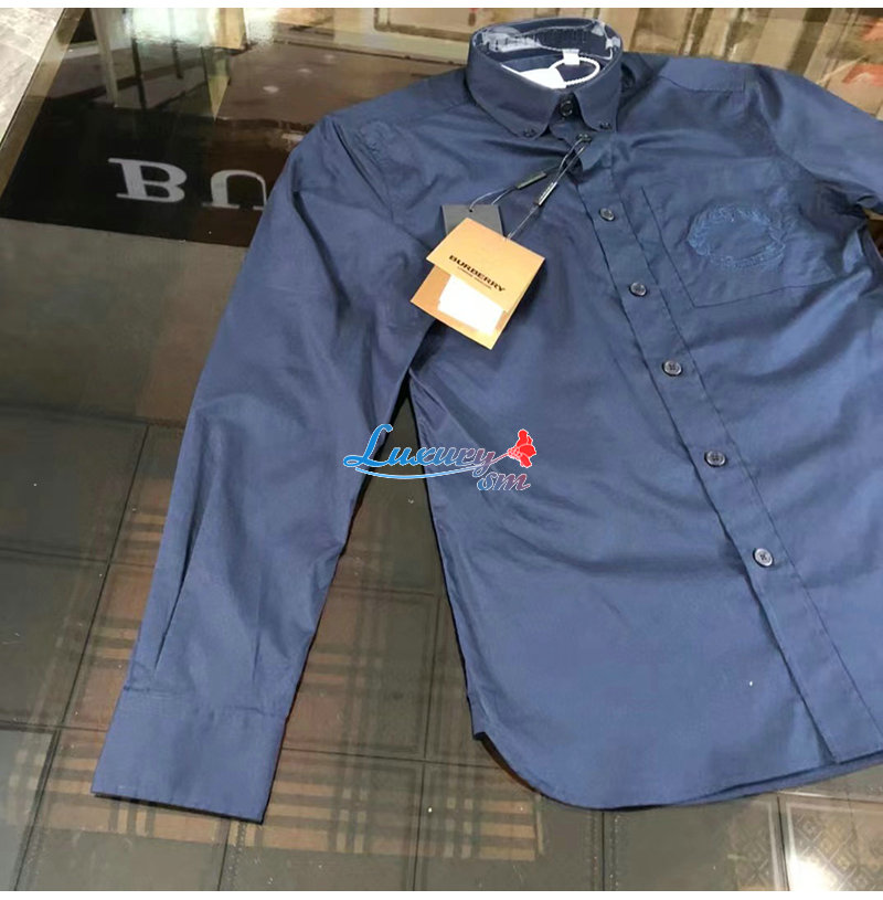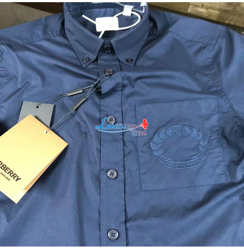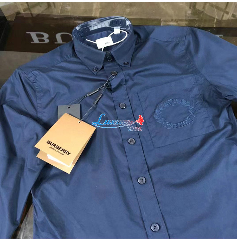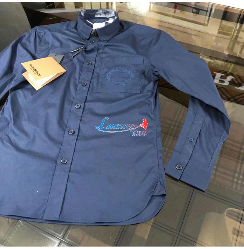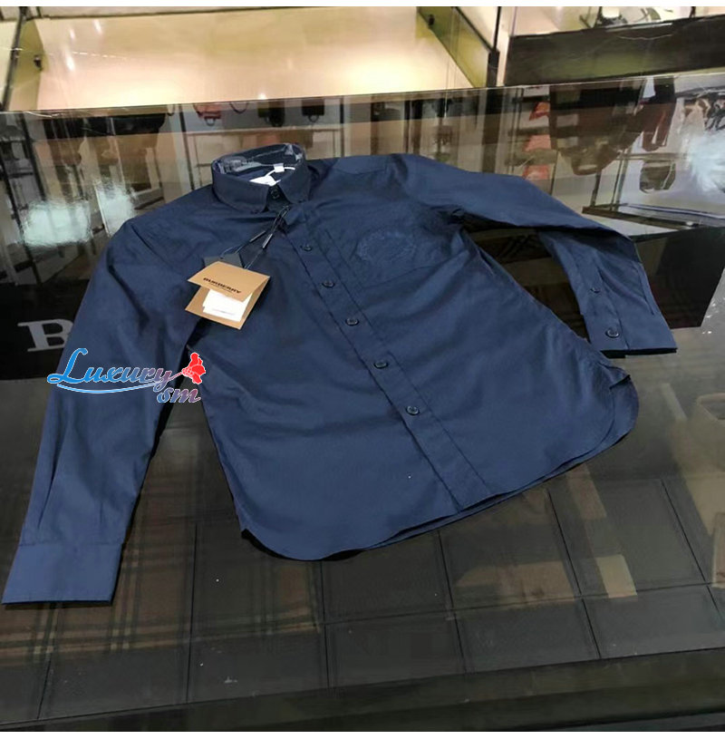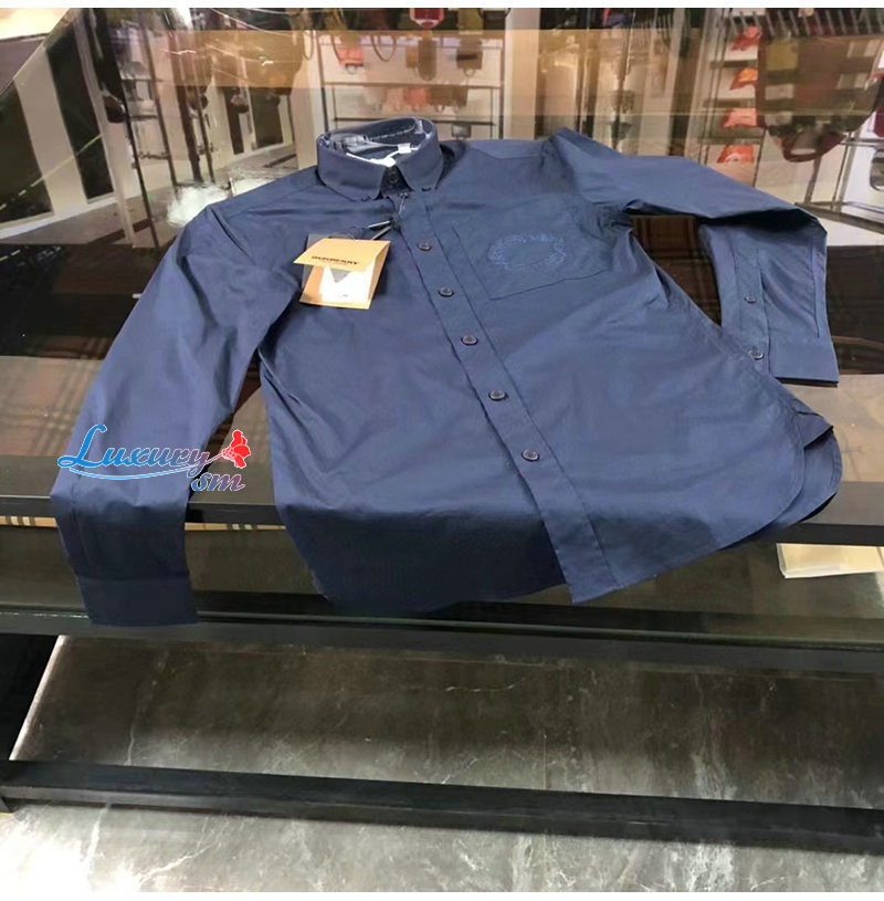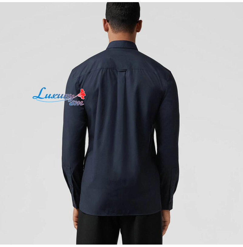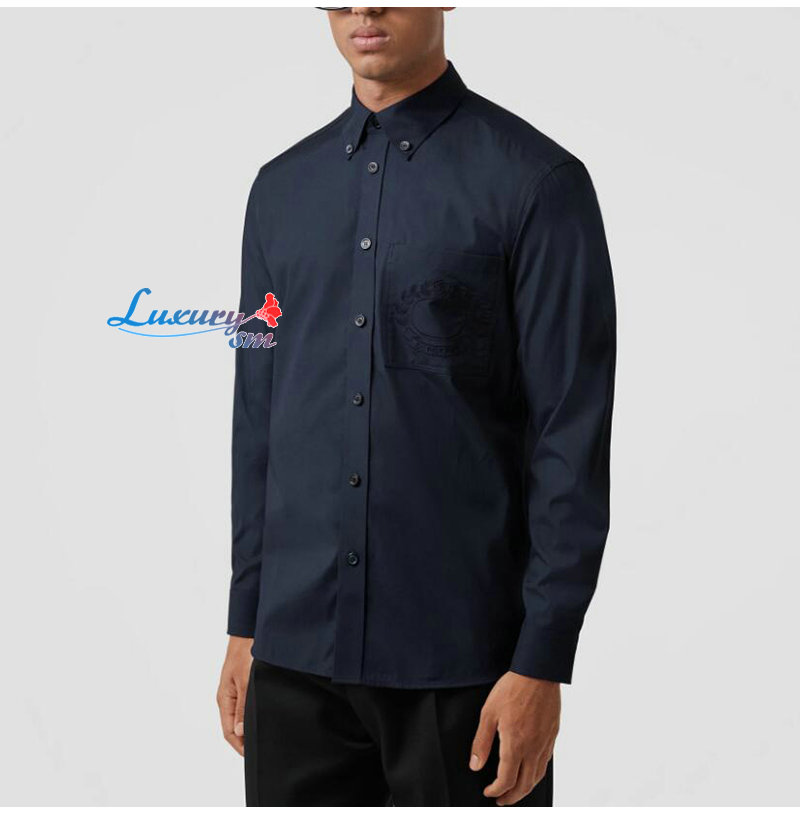 BURBERRY-80648761 버버리 네이비 엠브로이더리 오크 리프 크레스트 스트레치 셔츠 남성용