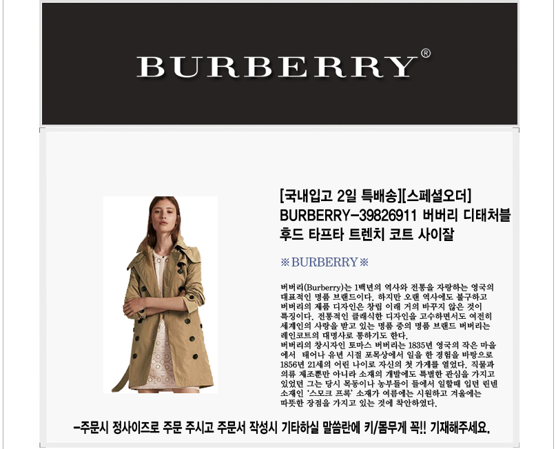 BURBERRY-39826911 버버리 디태처블 후드 타프타 트렌치 코트 사이잘