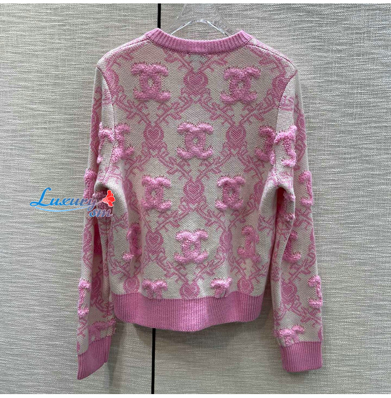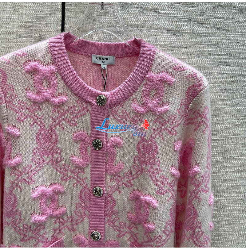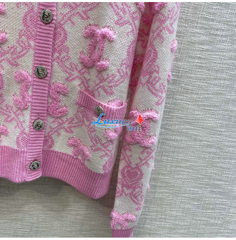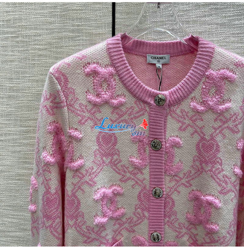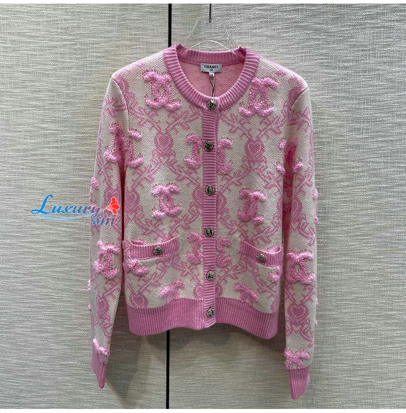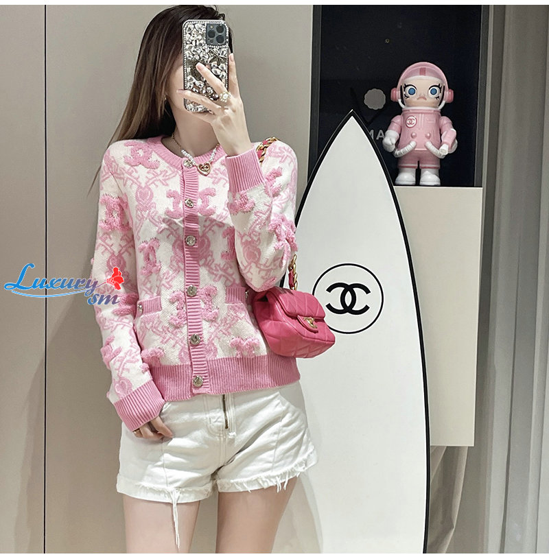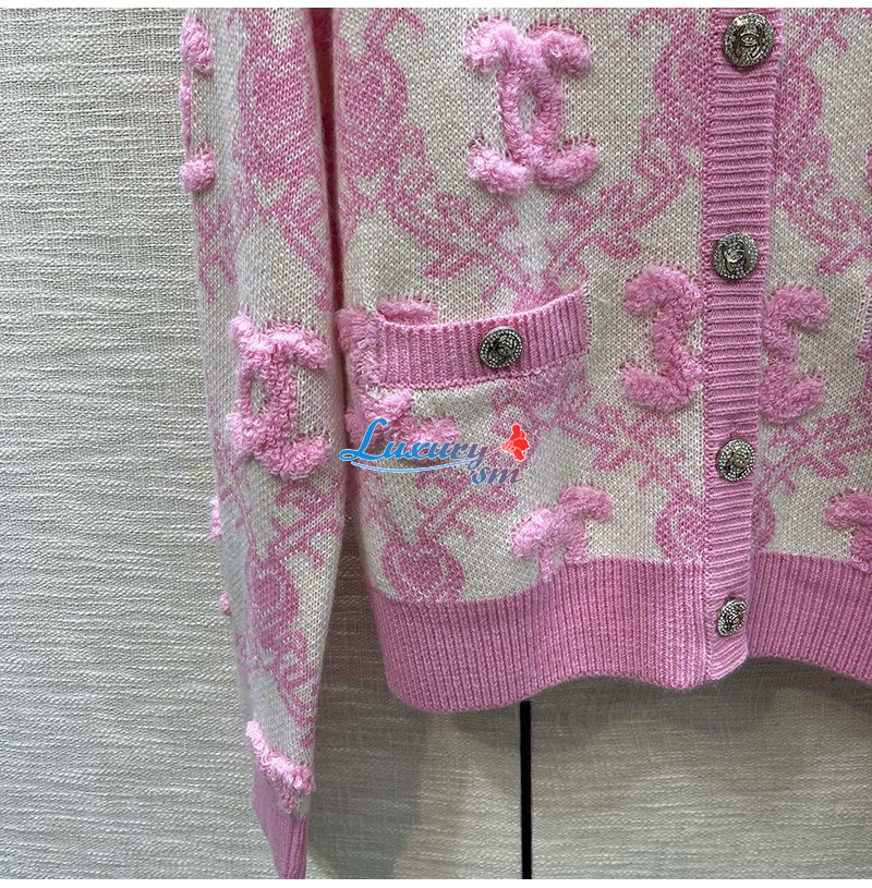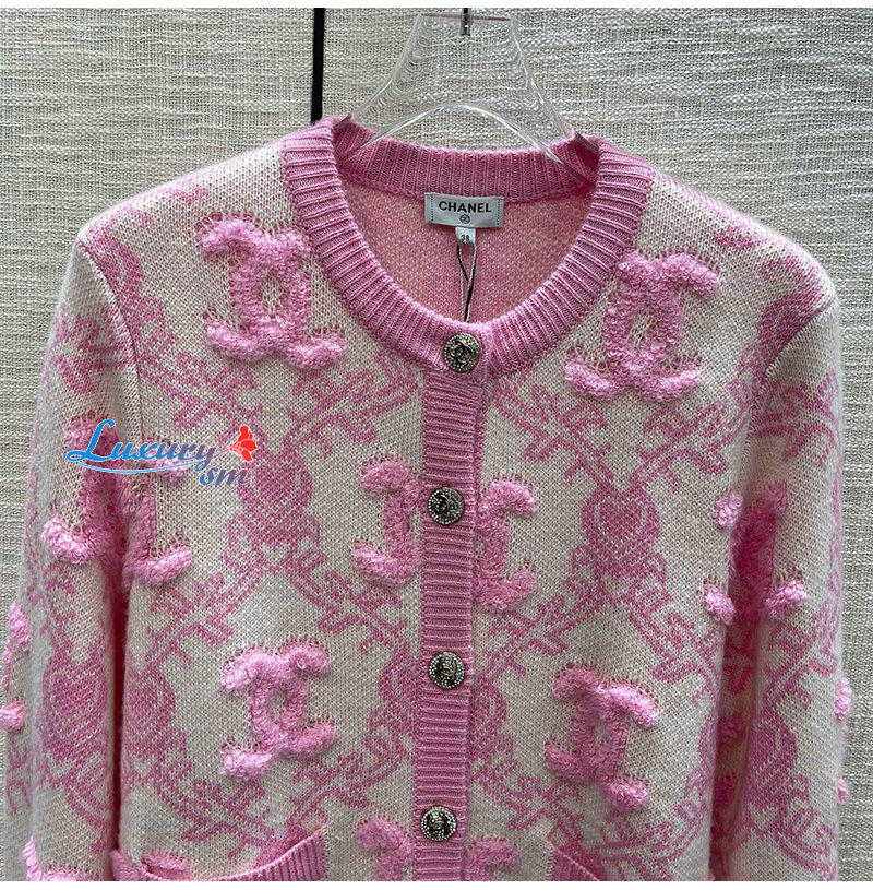 CHANEL-01215 샤넬 핑크 CC 로고 아플리케 장식 가디건 여성용