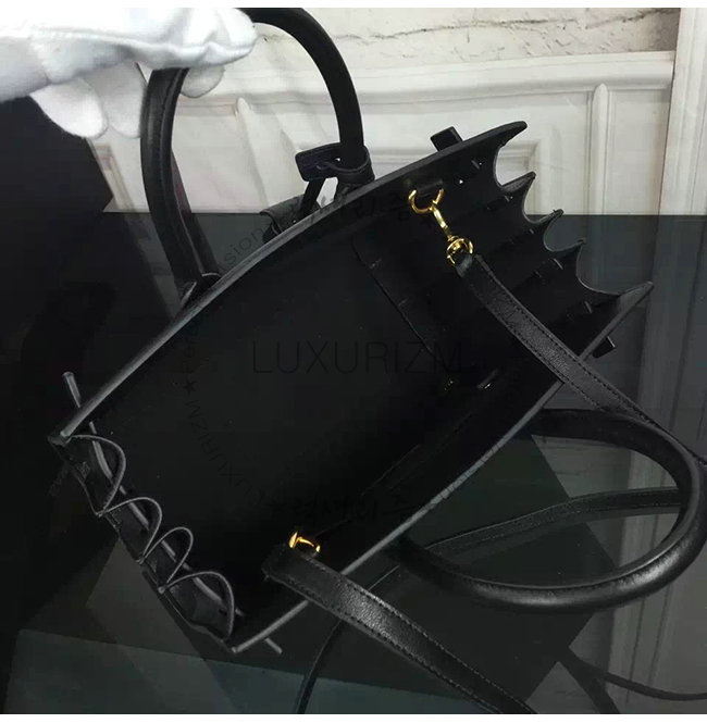 양각으로 새겨진 생 로랑 시그니처와 탈부착 가능한 숄더 스트랩의 시그니처 생 로랑 백.