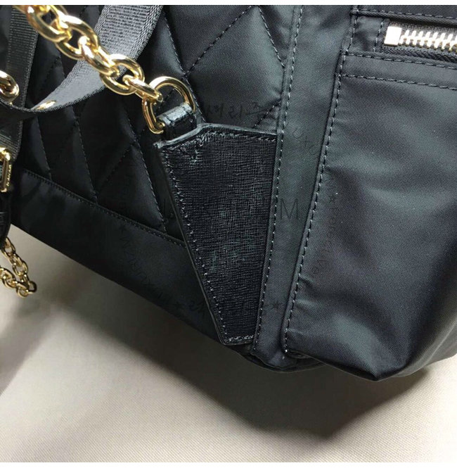 유광 금속 체인이 부착된 쿠션감 있는 어깨끈과 가죽 트리밍이 돋보이는 가벼운 백팩.