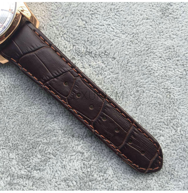 케이스는 18캐럿 레드 골드 베젤과 브라운 컬러의 가죽 스트랩을 함께 장착하고 있습니다.