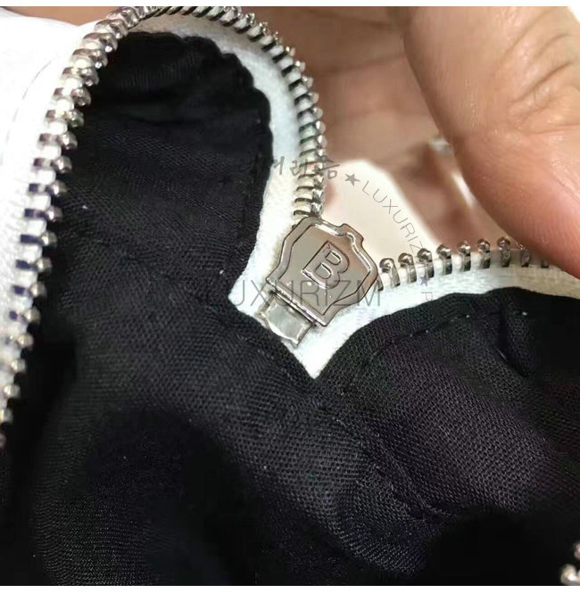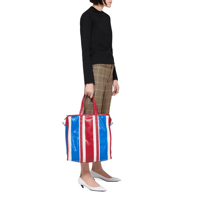 -내부 발렌시아가 로고 택장식의 지퍼1개와 패치포켓1개/엇갈림 배열 기법의 아레나가죽 스트라이프.