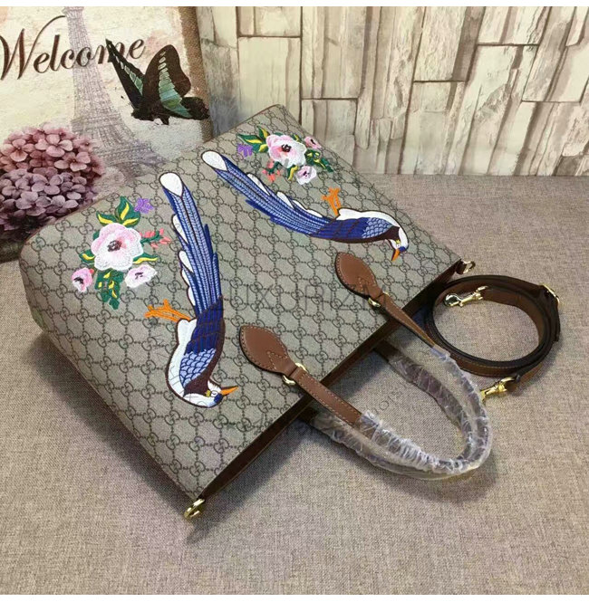 수작업으로 마감한 공작과 플로라 자수 아플리케가 장식된 구찌 가든