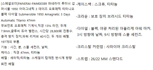 [스페셜오더]PANERAI-PAM00389 파네라이 루미너 섭머시블 1950 아마그네틱 3 데이즈 오토매틱 티타니오 블랙 다이얼 Submersible 1950 Amagnetic 3 Days Automatic Titanio 47mm