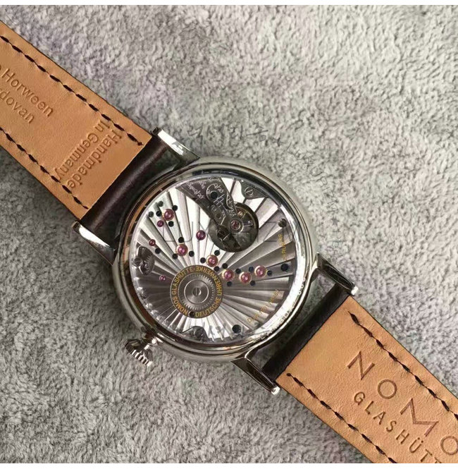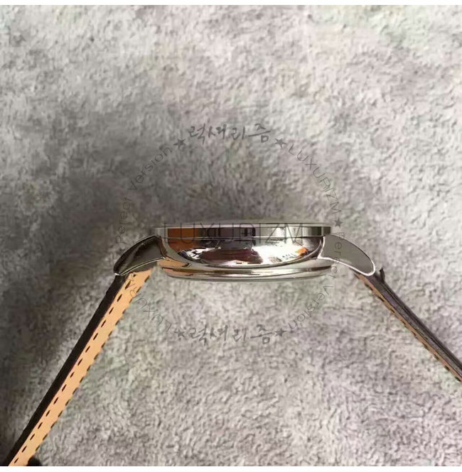 -스테인레스 스틸 케이스/용두 노모스 각인/블랙 레더 벨트식 스트랩/생활방수.