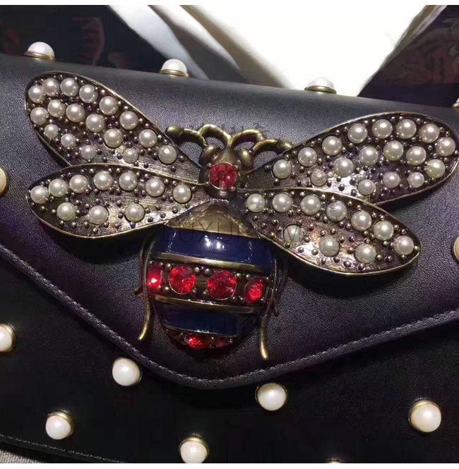 -2017 크루즈 컬렉션/블랙 가죽 및 펄 장식/메탈 벌 장식의 펄 및 크리스탈 디테일/메탈 잠금장치.