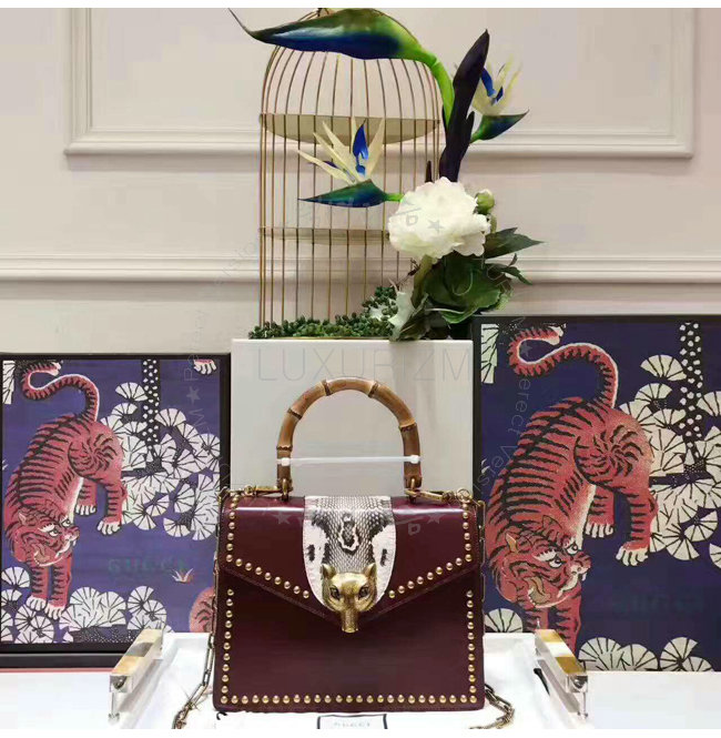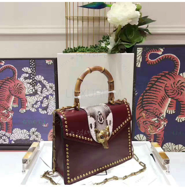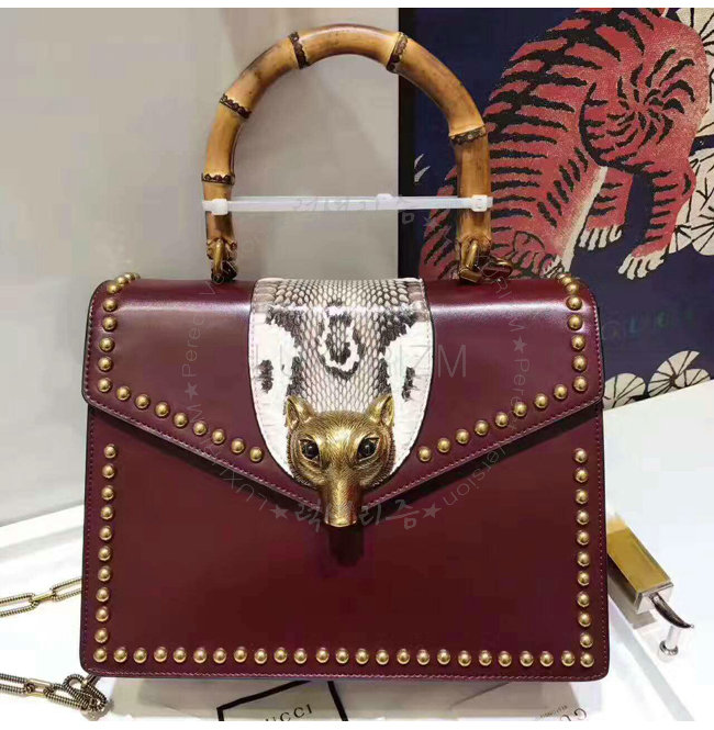 2017 SS 글로시 가죽 여우 모양 메탈 트리밍 대나무 핸들 탑 핸들 체인 숄더 스트랩 밤부백
