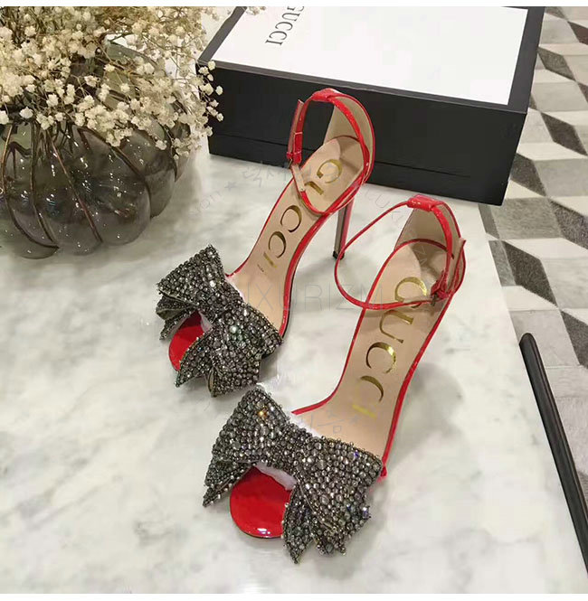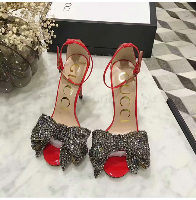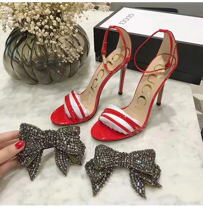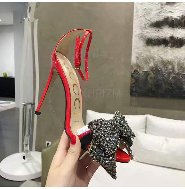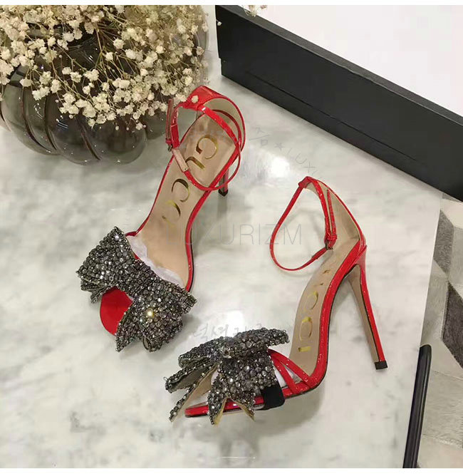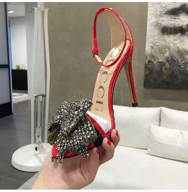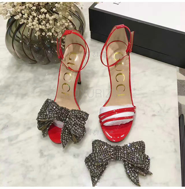 GUCCI-465995 6433 구찌 탈착 가능한 크리스탈 새틴 패턴 레드 가죽 샌들 여성용
