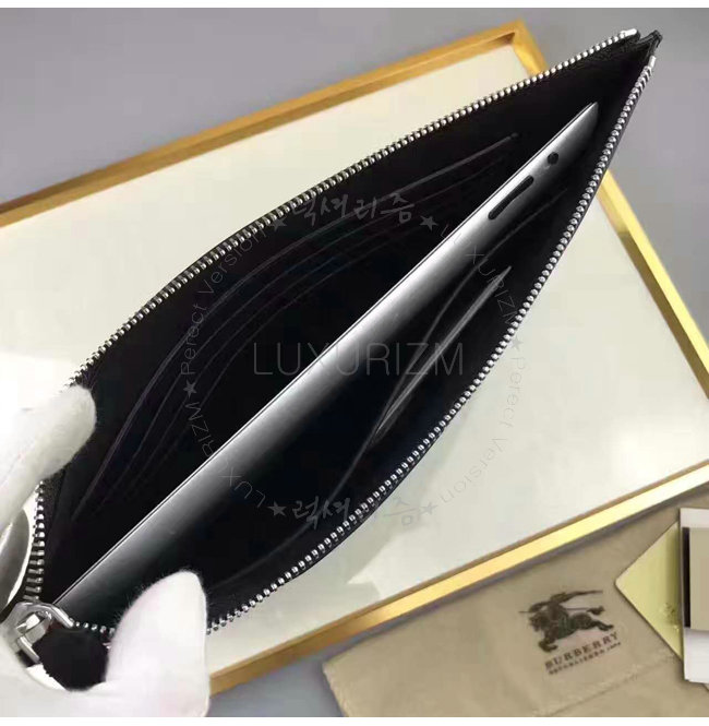 시그니처 런던 체크 패턴과 부드러운 가죽이 어우러진 지퍼 파우치. 태블릿을 담을