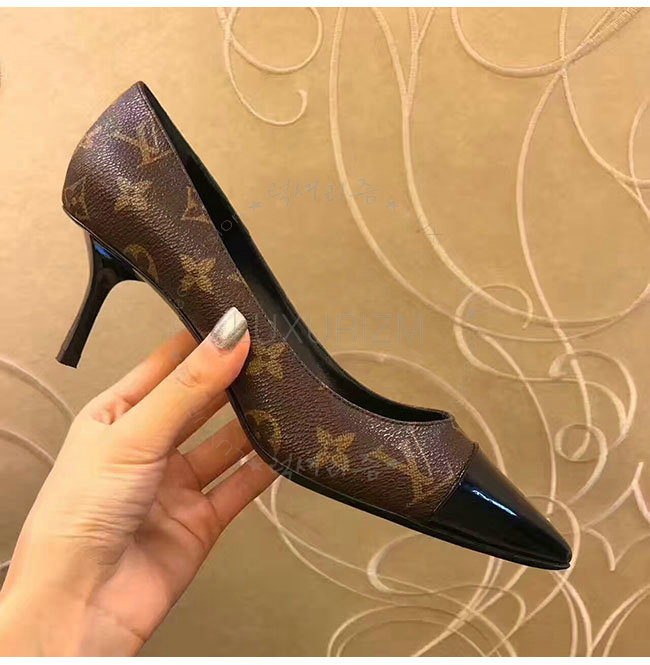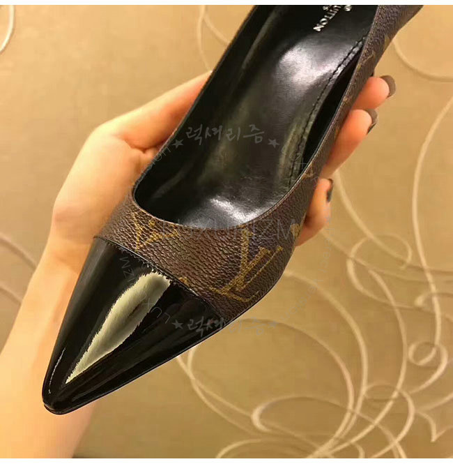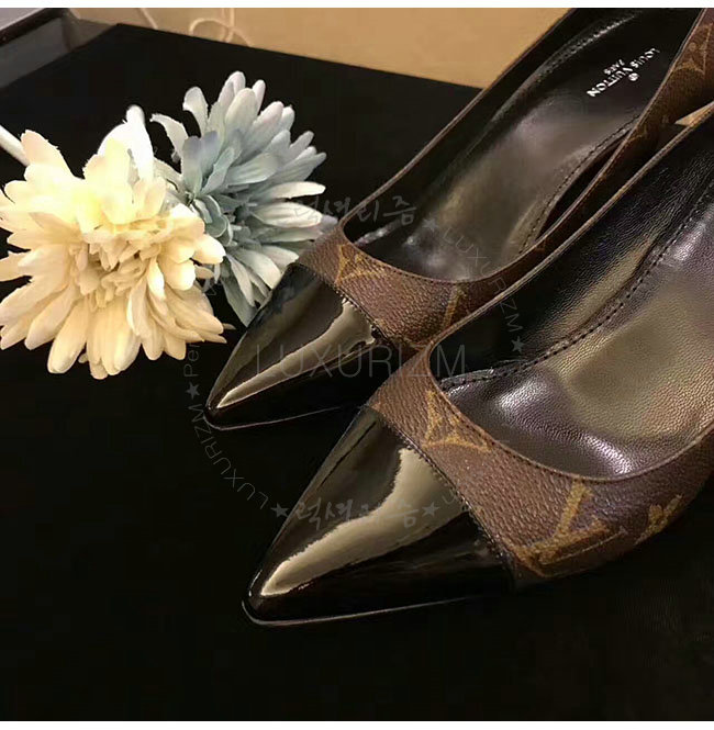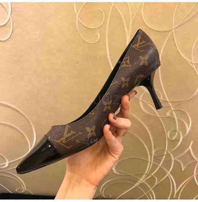페이턴트 모노그램 캔버스 소재의 키튼 힐 펌프스입니다.뾰족한 앞 코에 페이턴트