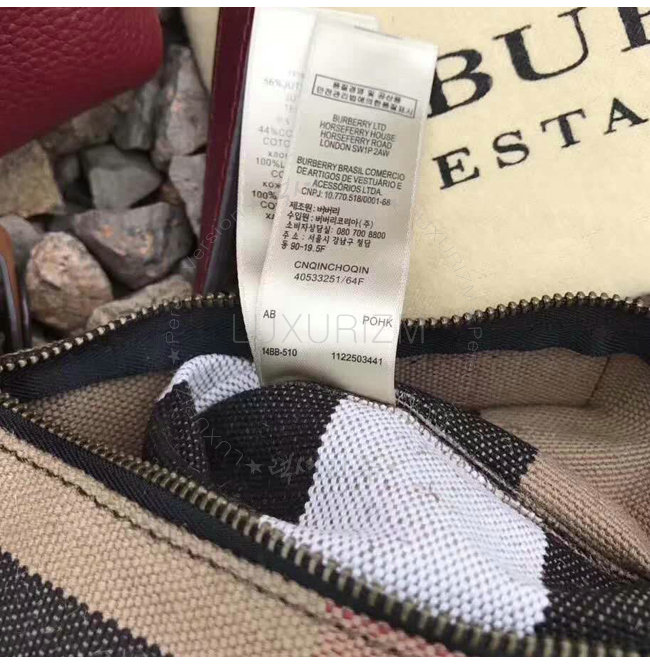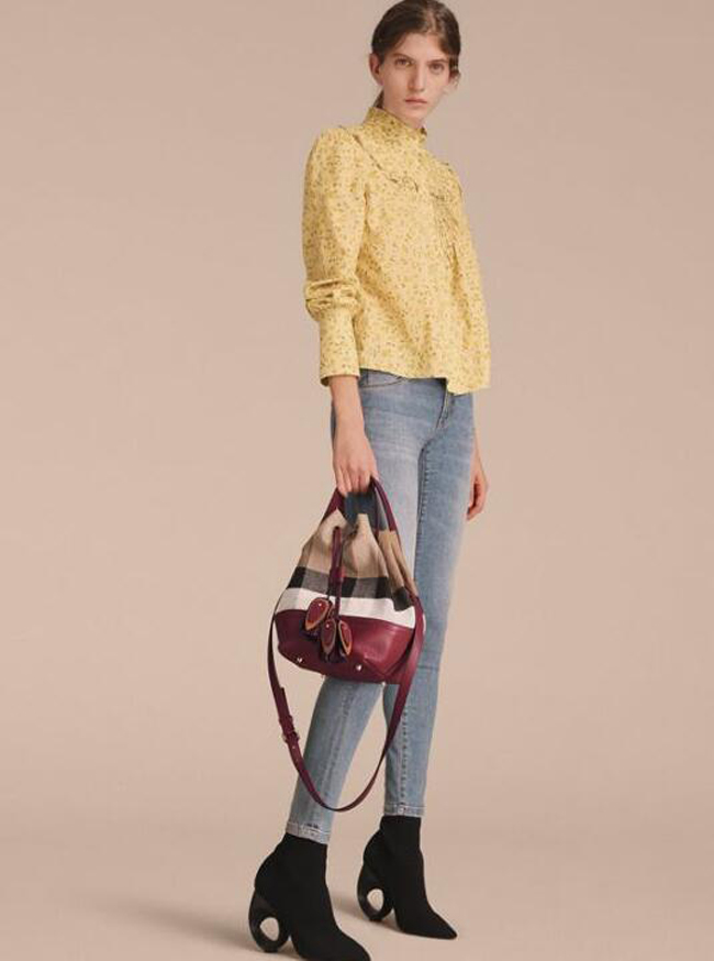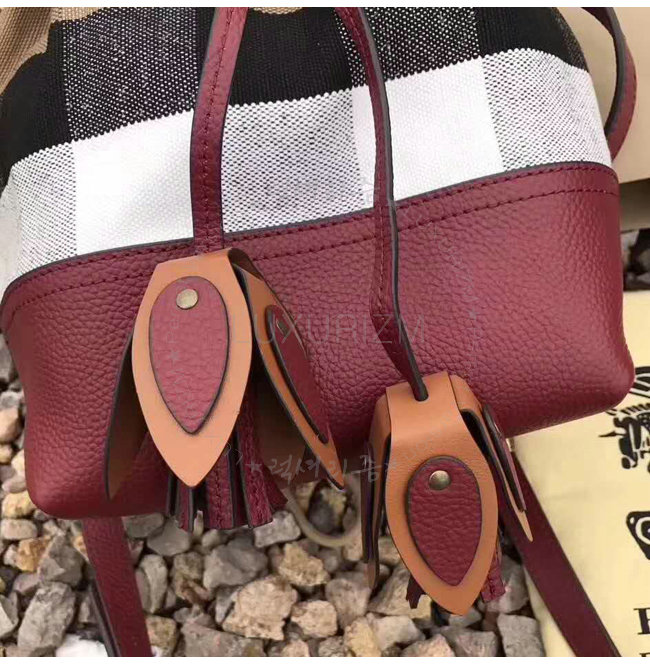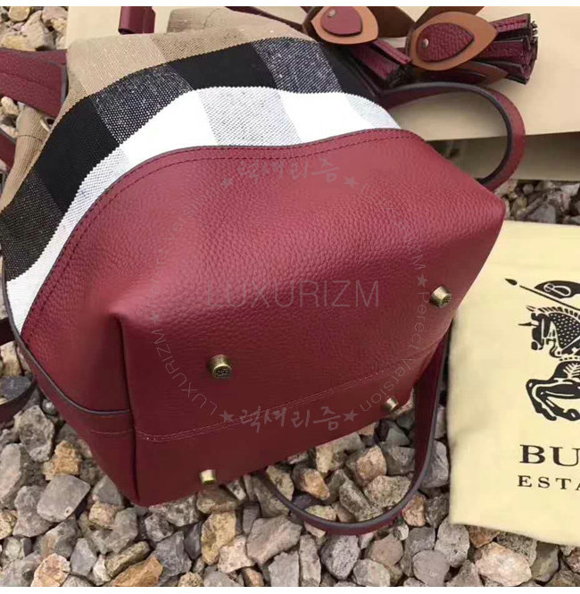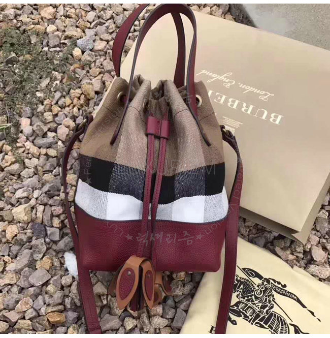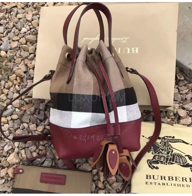 BURBERRY-40533221 버버리 스몰 캔버스 체크 가죽 버킷 백 버건디 레드