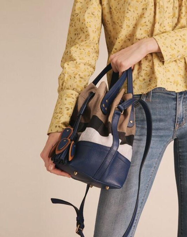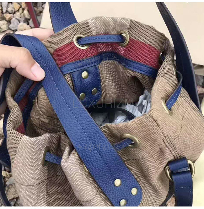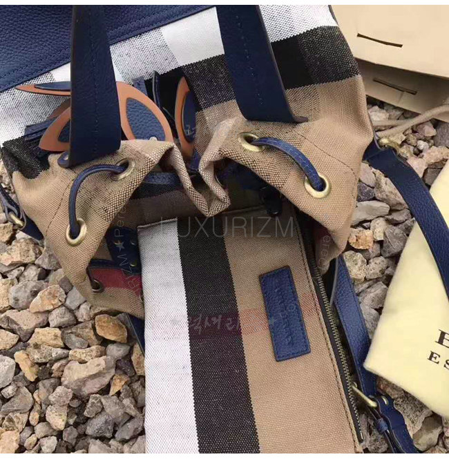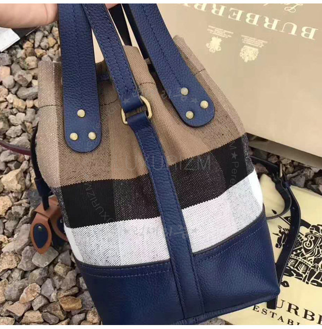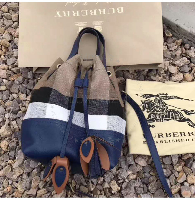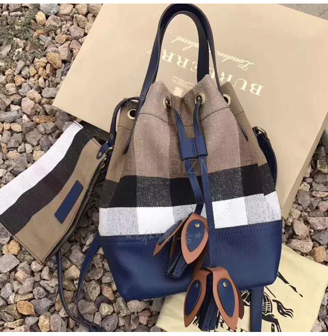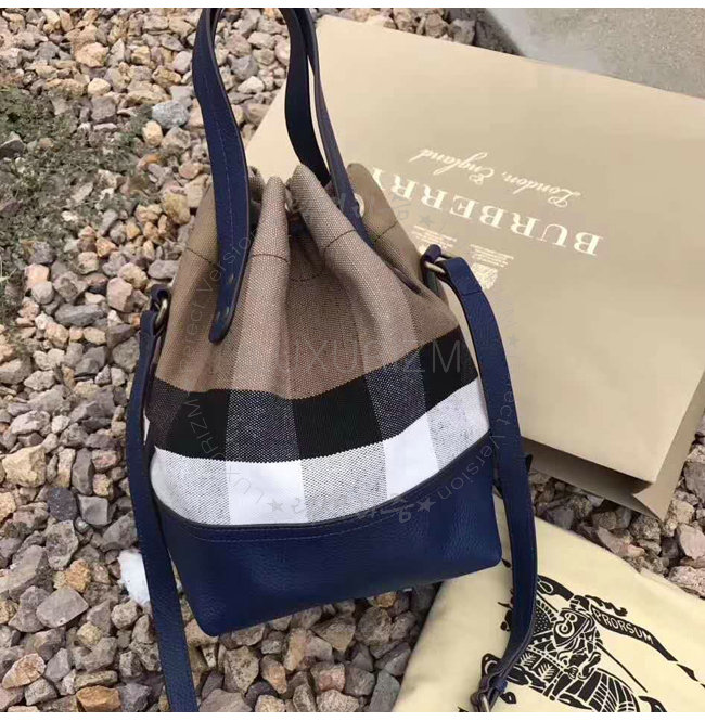 BURBERRY-40533221 버버리 스몰 캔버스 체크 가죽 버킷 백 브릴리언트 스카이블루