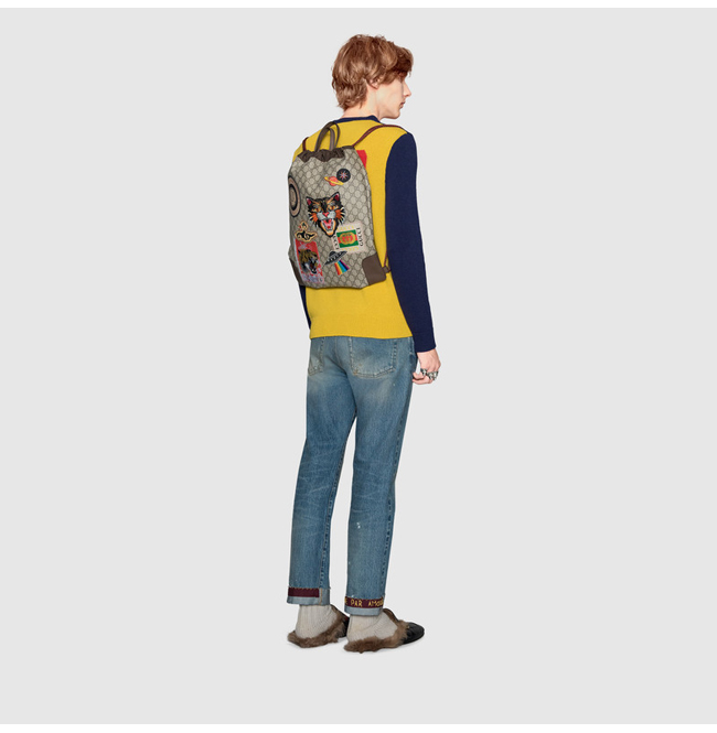 구찌 쿠리에 소프트 GG 수프림 드로우스트링 백팩. 여행이라는 주제에 잘 어울리는 프린트 장식