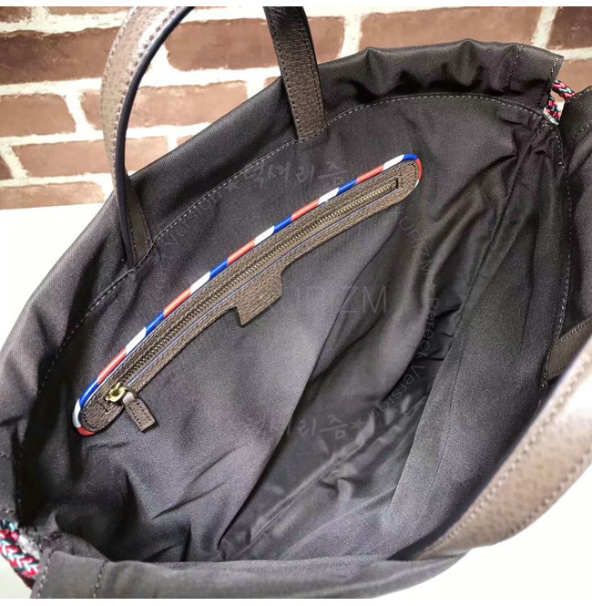프린트 아플리케 내부 지퍼 포켓 더블 가죽 핸들 드로우스트링 으로 활용할 수 있는 로프 스트랩.