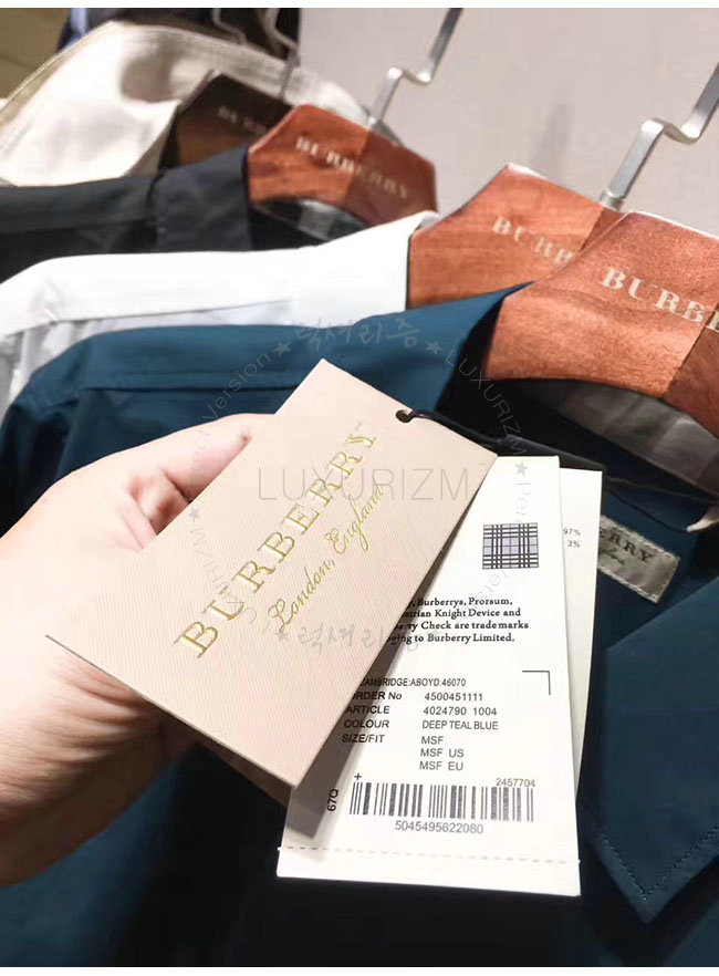 BURBERRY-40247901 버버리 딥 틸 블루 체크 디테일 스트레치 코튼 포플린 셔츠 남성용