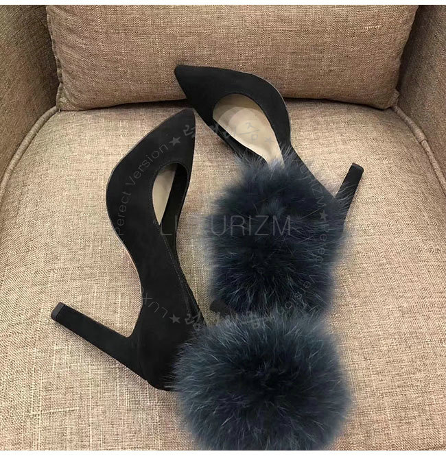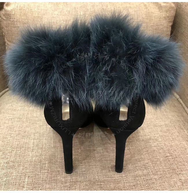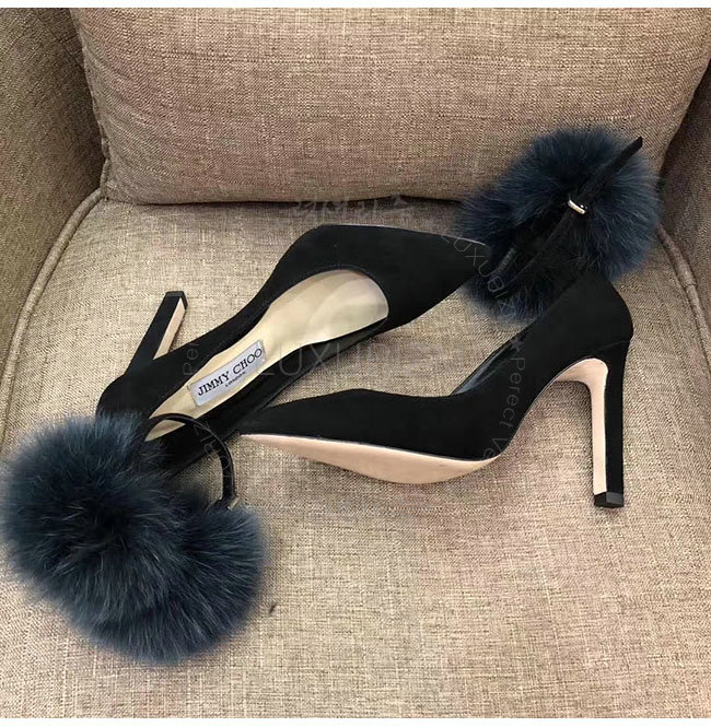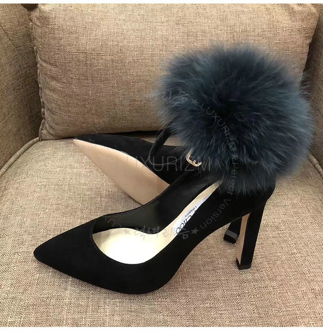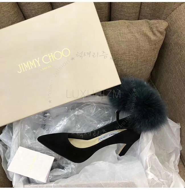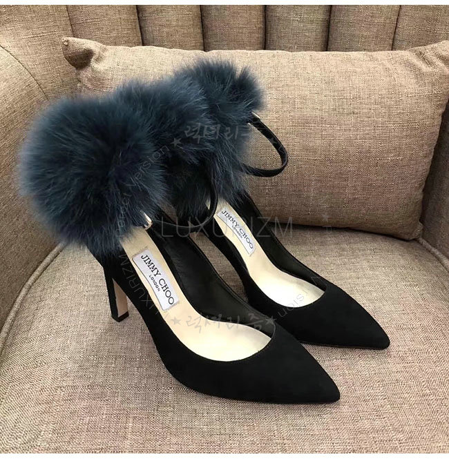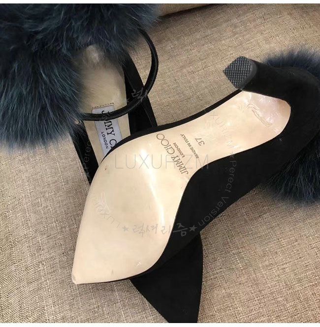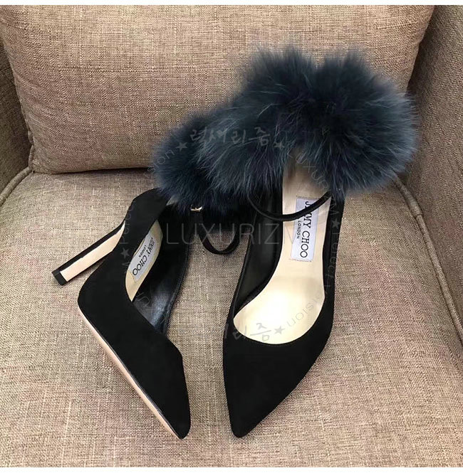 JIMMY CHOO- 지미추 블랙 스웨이드 여우털 뽈 펌프스 여성용