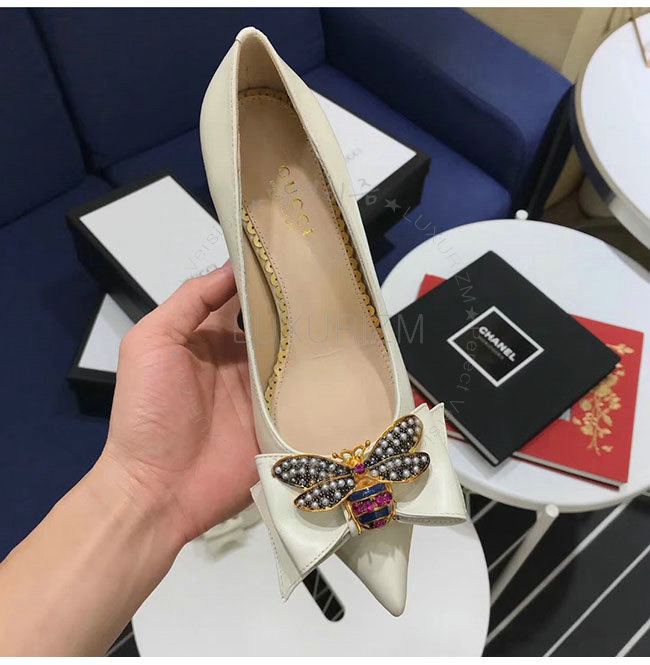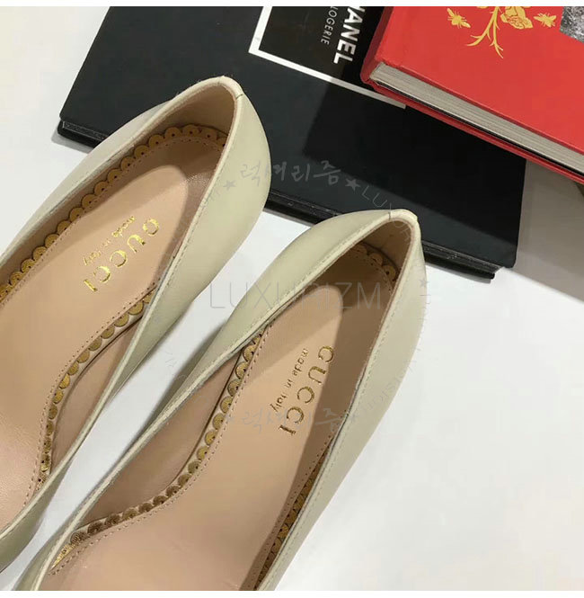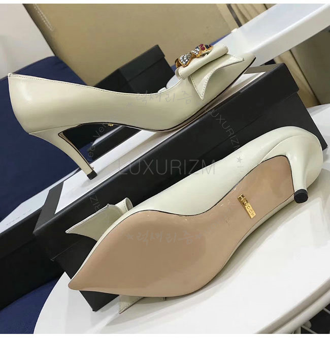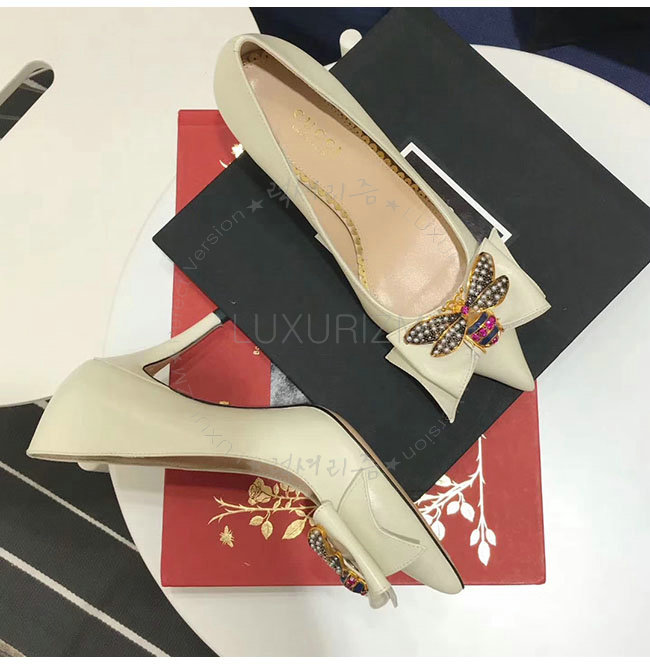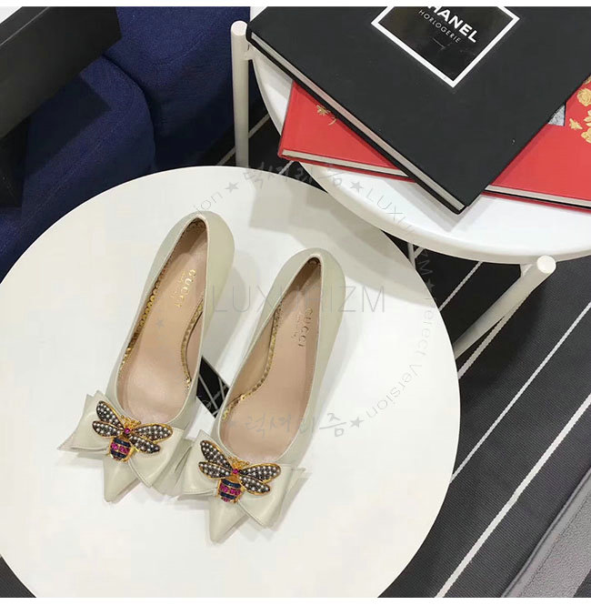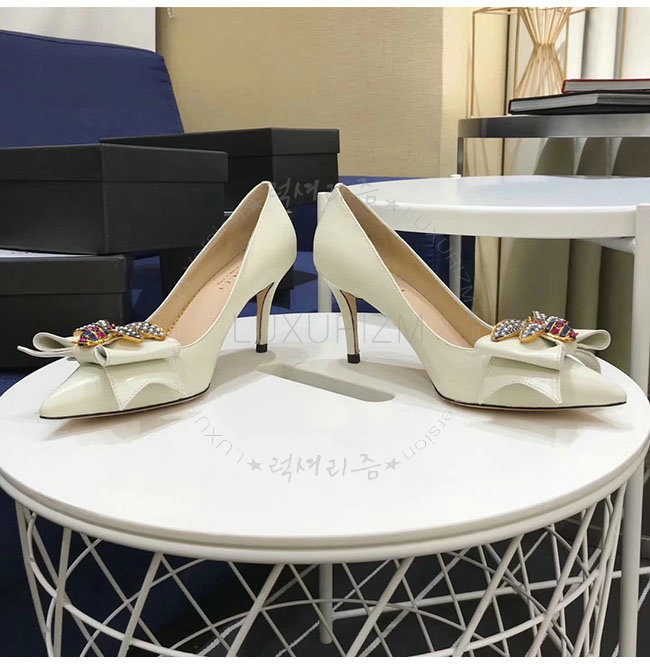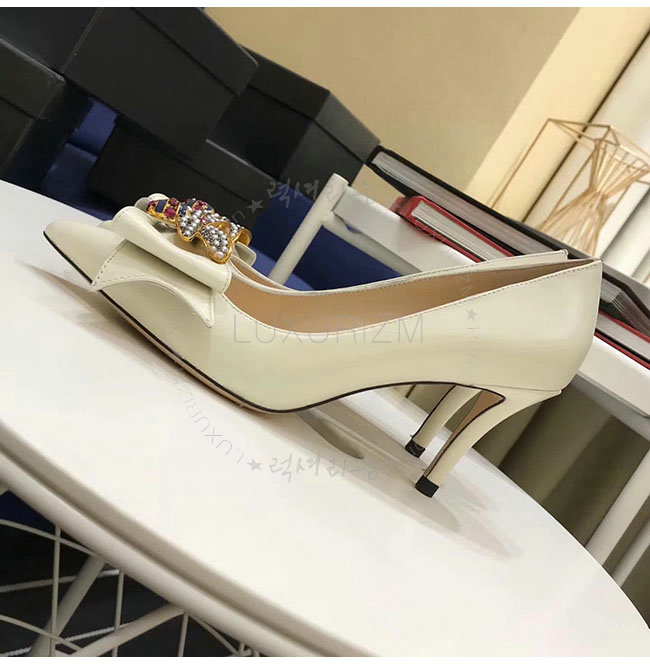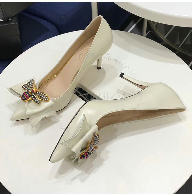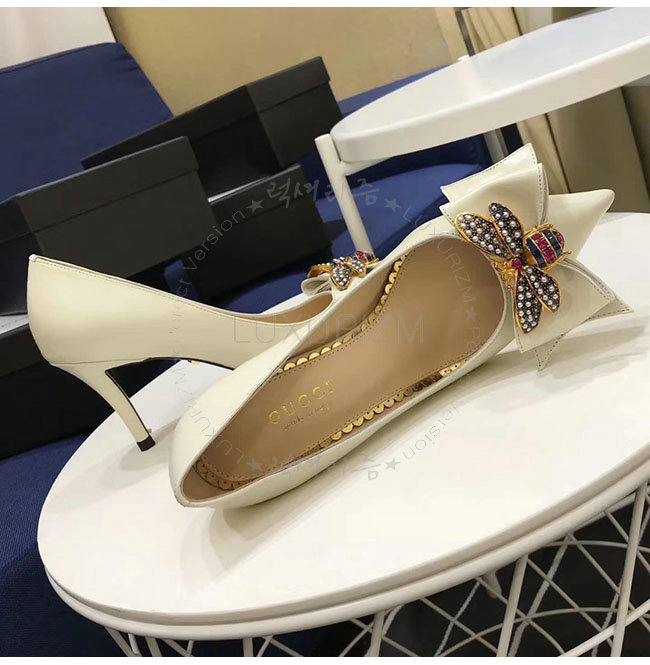 GUCCI-496641 9526 구찌 화이트 보우 디테일의 가죽 미드힐 펌프스 여성용