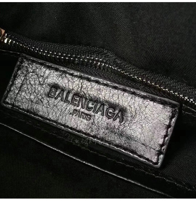처리된 발렌시아가 택 장식의 지퍼와 패치포켓 앞면에 양각처리된 골드 발렌시아가 로고.