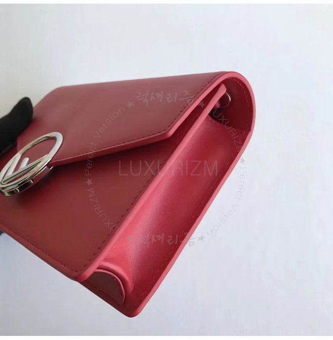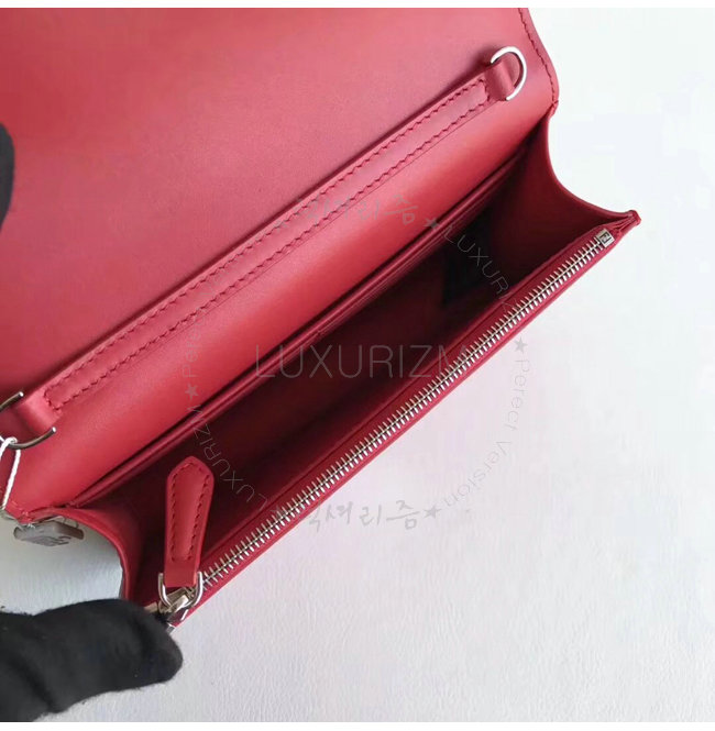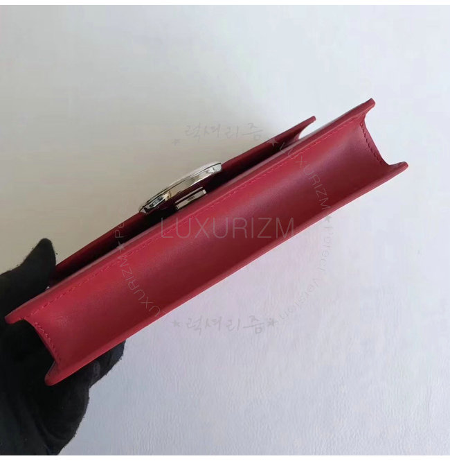 탈부착 가능한 체인 숄더 스트랩. 펄 레드 컬러의 송아지 가죽 소재. 팔라듐 피니싱 메탈장식.
