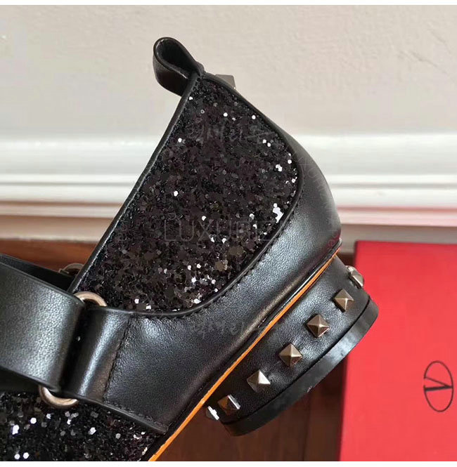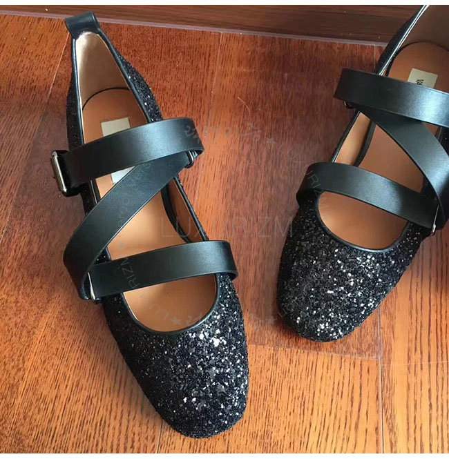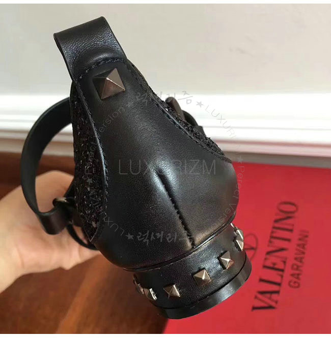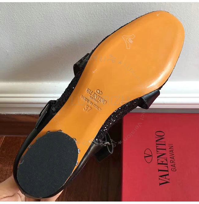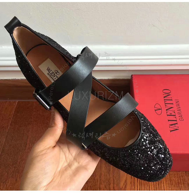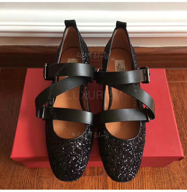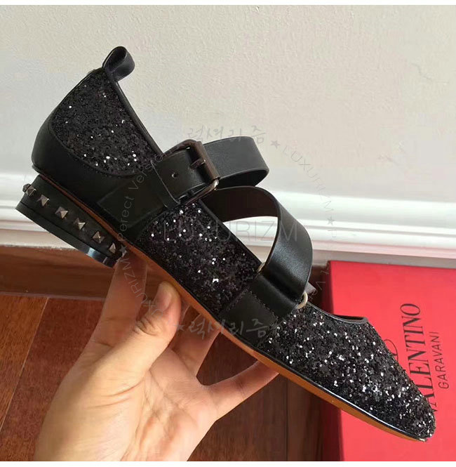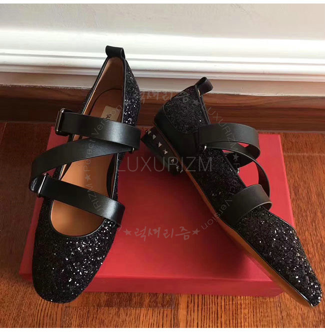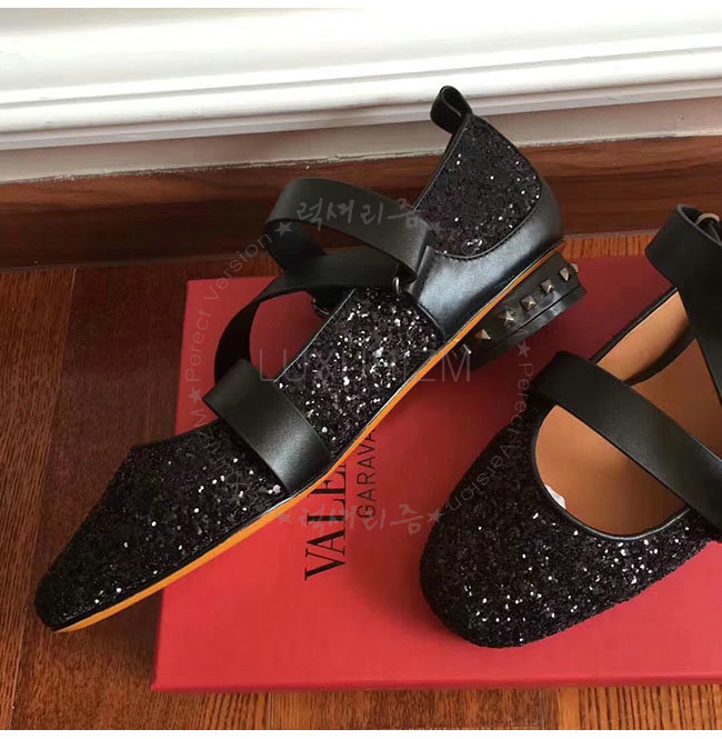 VALENTINO-NW1S0C 발렌티노 블랙 글리터 패브릭 스트랩 앤 스터드 발레리나 플랫 슈즈 여성용
