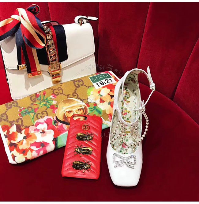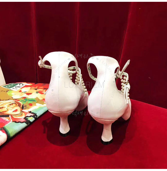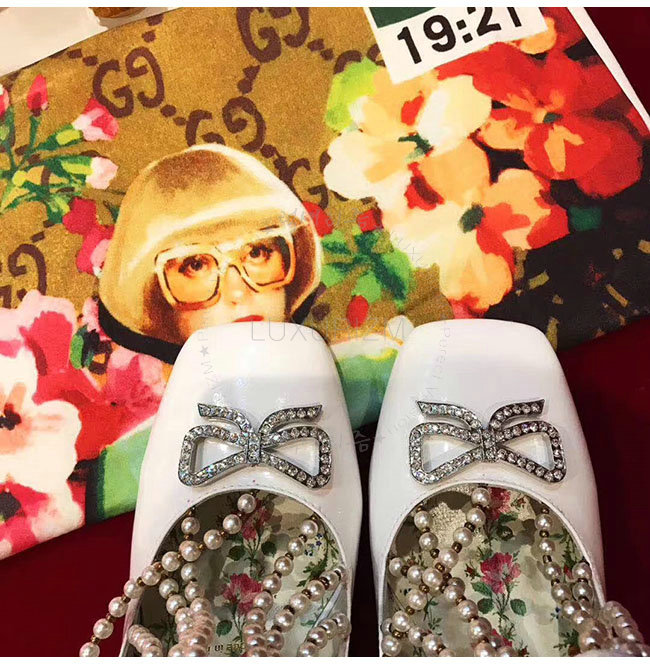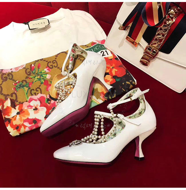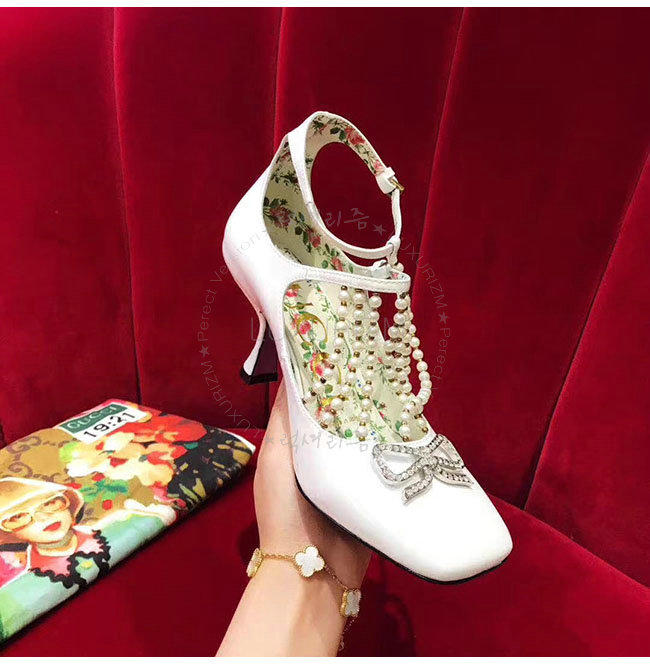 GUCCI-488662 9022 구찌 펄 디테일의 T 스트랩 화이트 가죽 펌프스