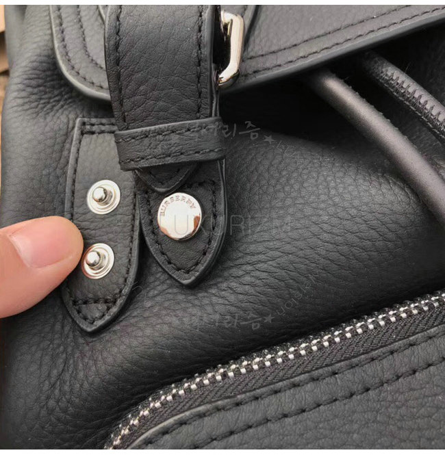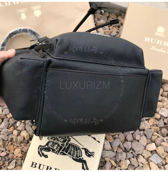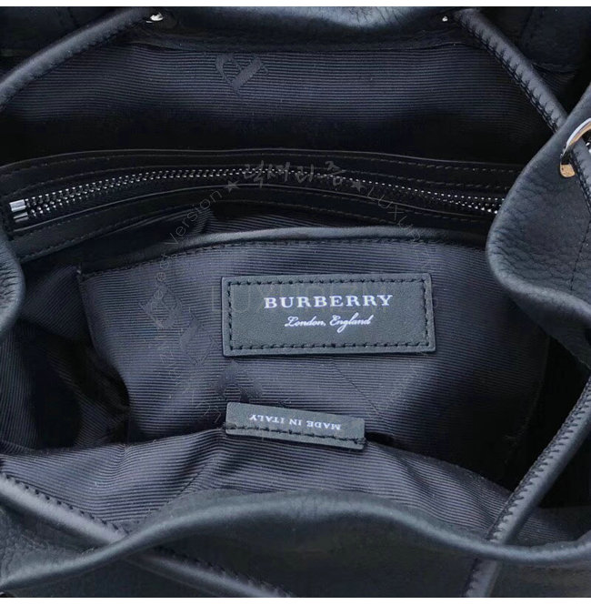 드로스트링 여밈 수작업으로 마감칠된 테두리 유광금속 하드웨어 앞면의 버버리 양각로고.
