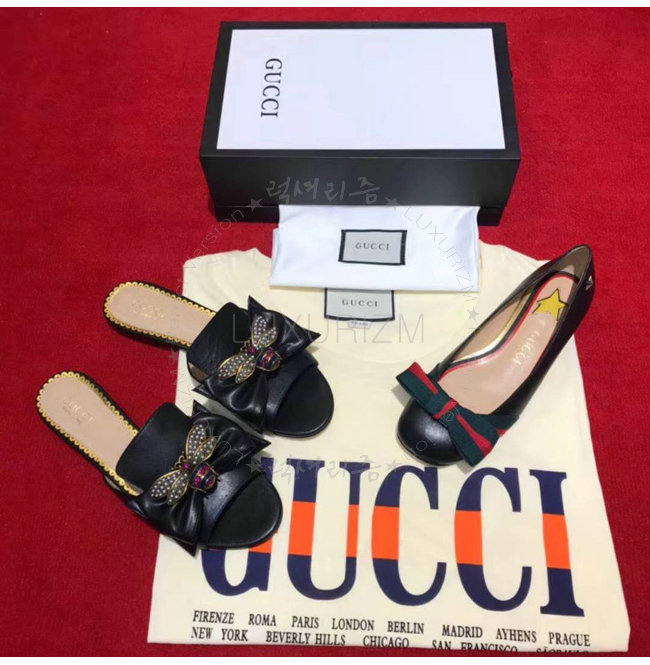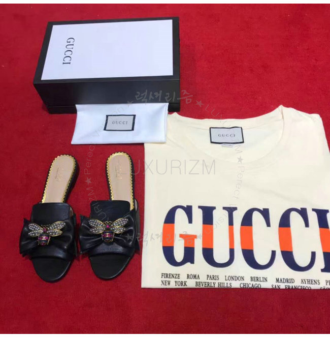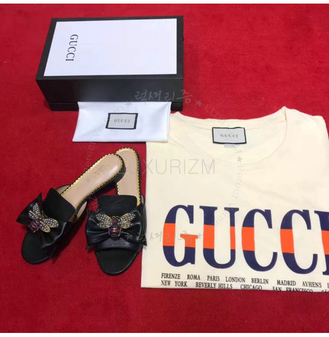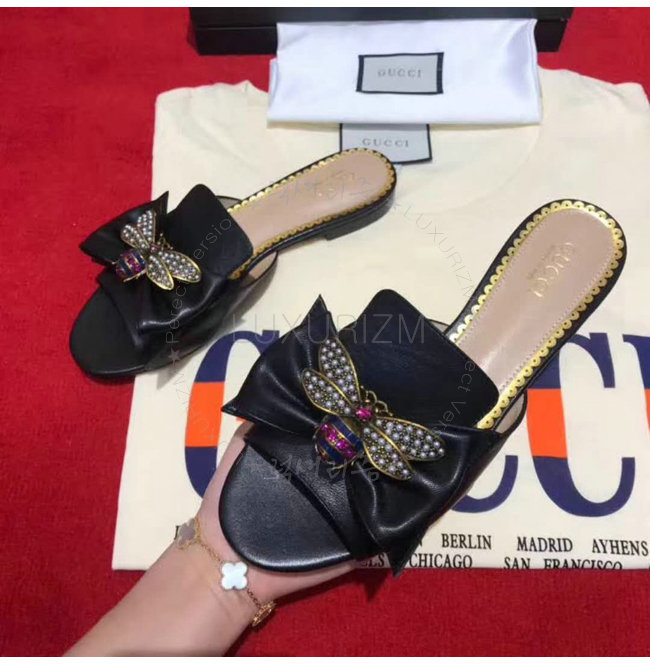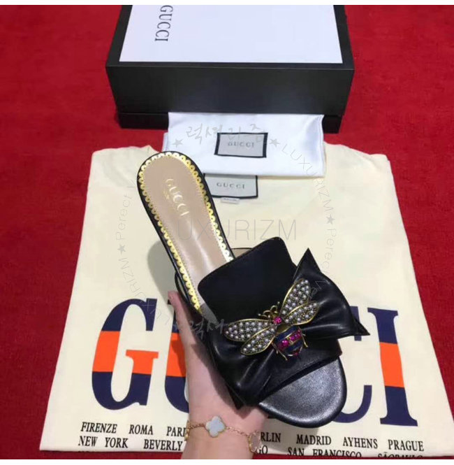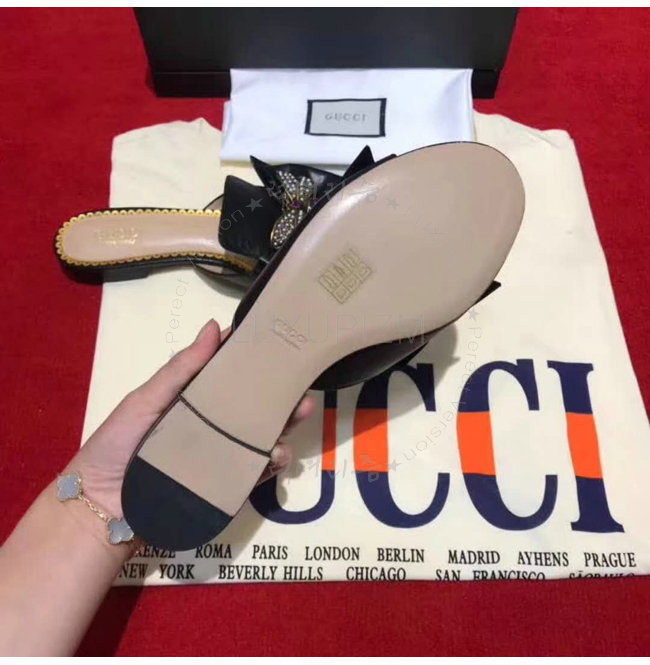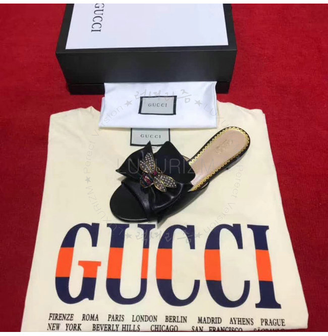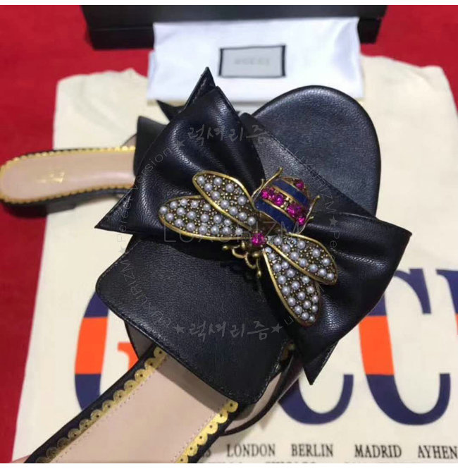 GUCCI-524639 1000 구찌 블랙 가죽 벌 모양 장식 슬라이드