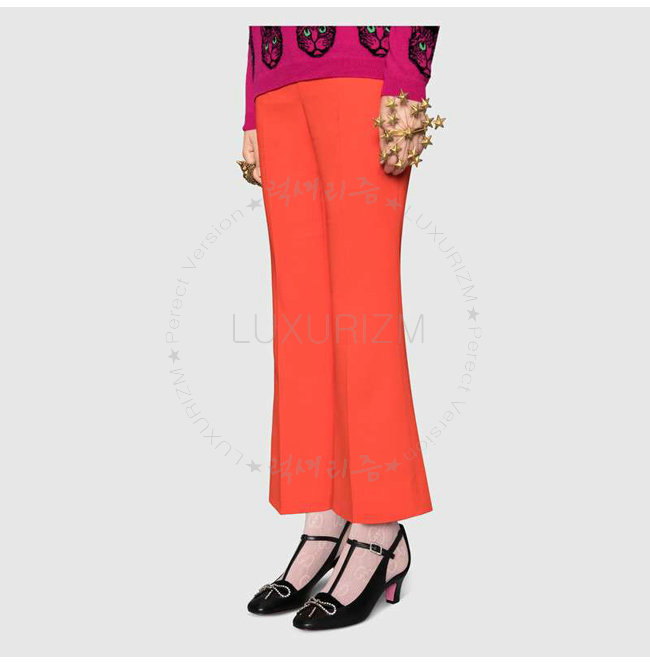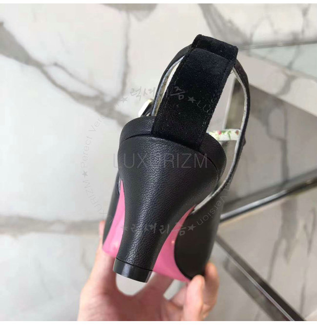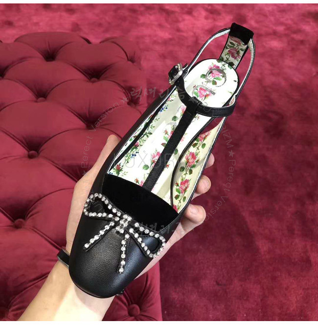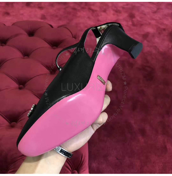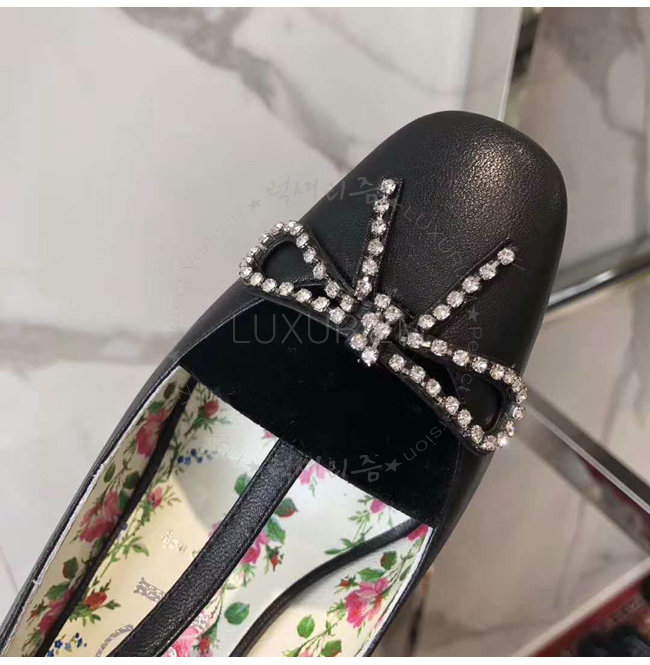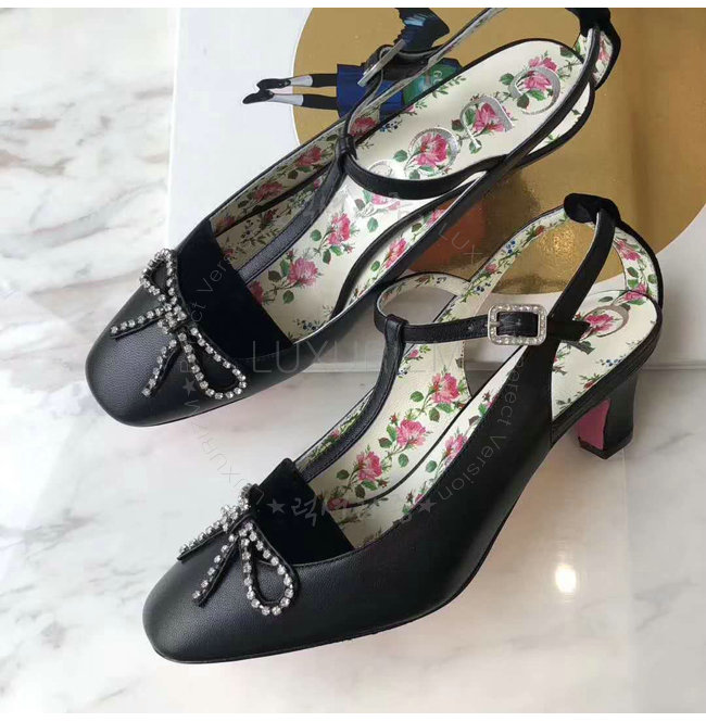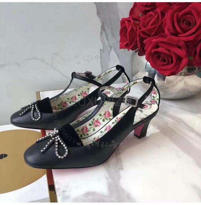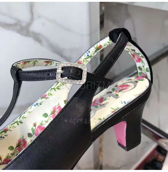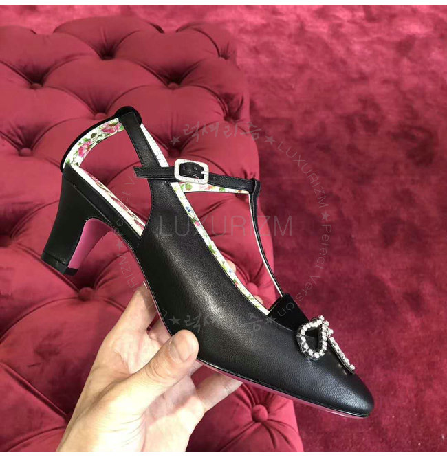 GUCCI-497484 1000 구찌 블랙 가죽 벨벳 T-스트랩 미드힐 펌프스