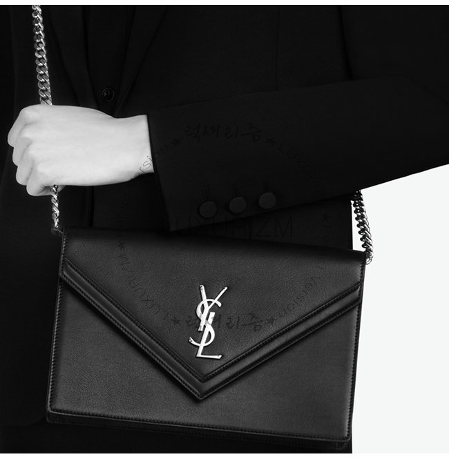 포인티드 플랩 메탈 YSL 시그니처 탈부착 가능한 체인과 가죽 스트랩 디테일의 서플 백.
