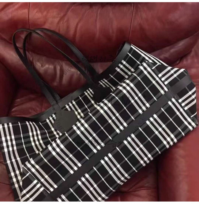 타탄 체크 패턴이 돋보이는 양면 디자인의 오버사이즈 토트. 접착면 소재로 제작된