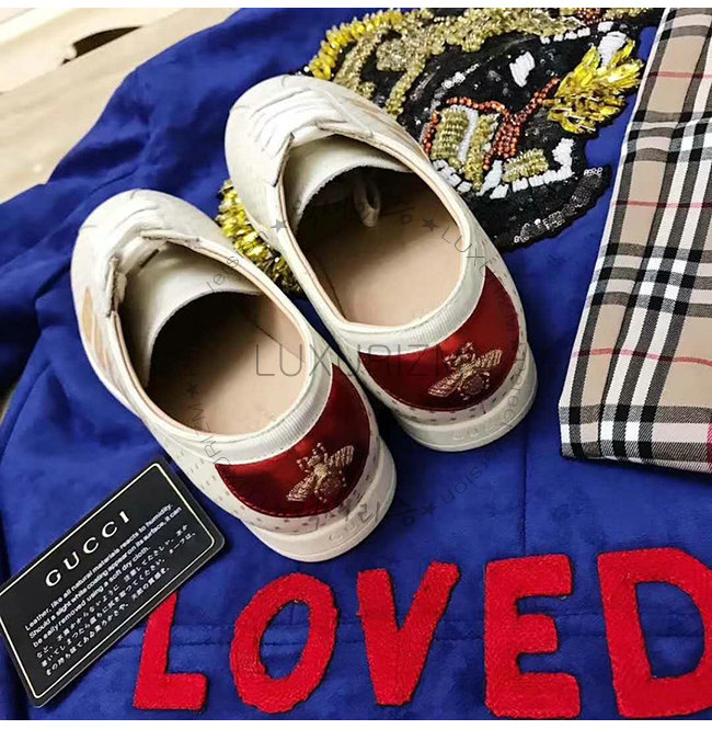 그로그랭 트리밍 양쪽 뒷면에 레드 메탈릭 가죽 디테일 및 벌 모양 골드 자수 러버 솔.