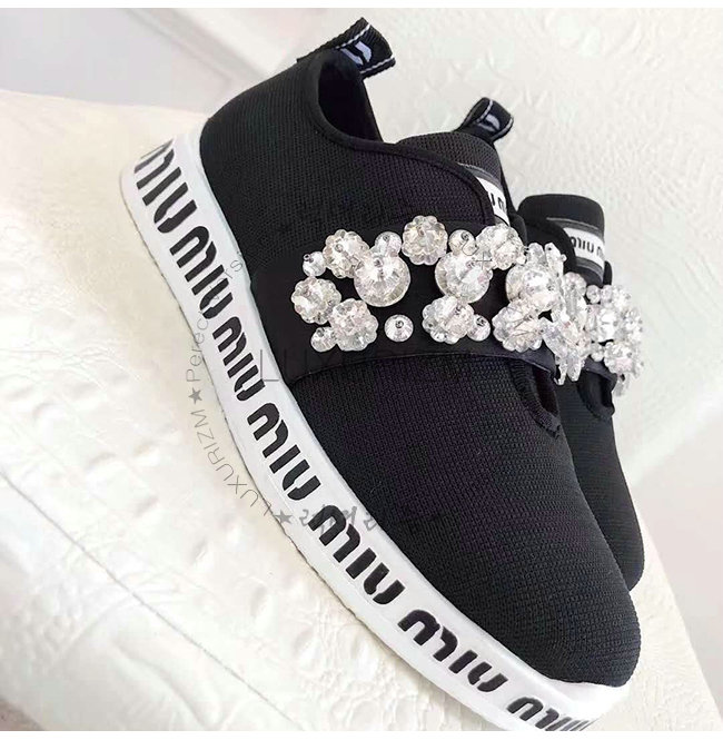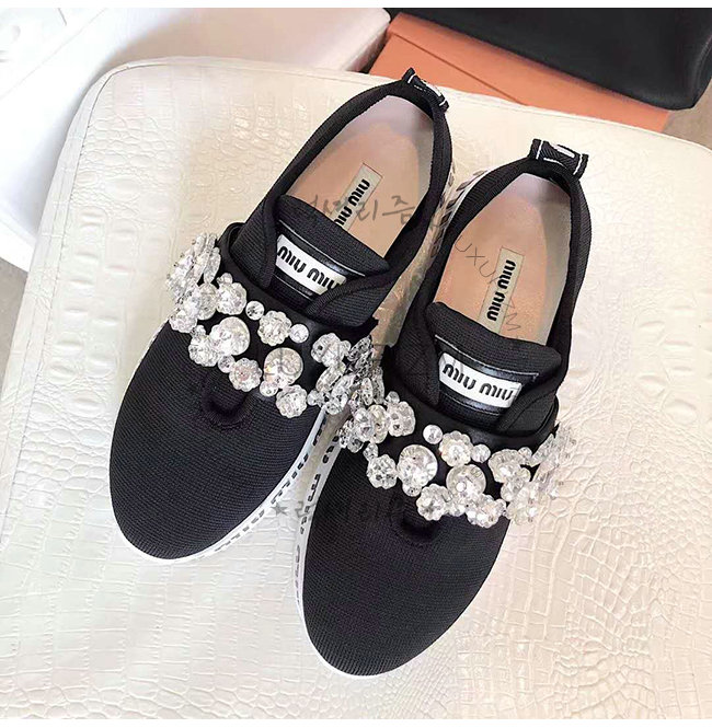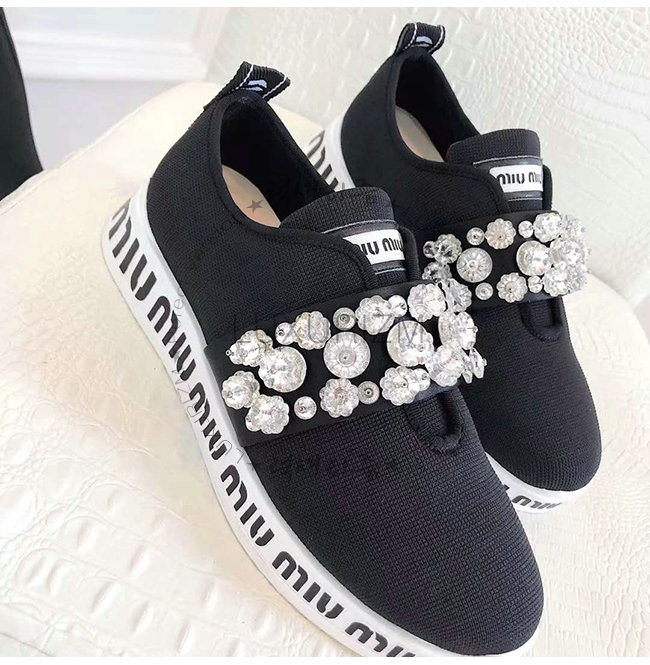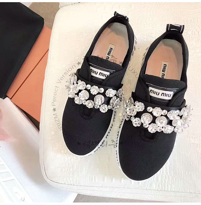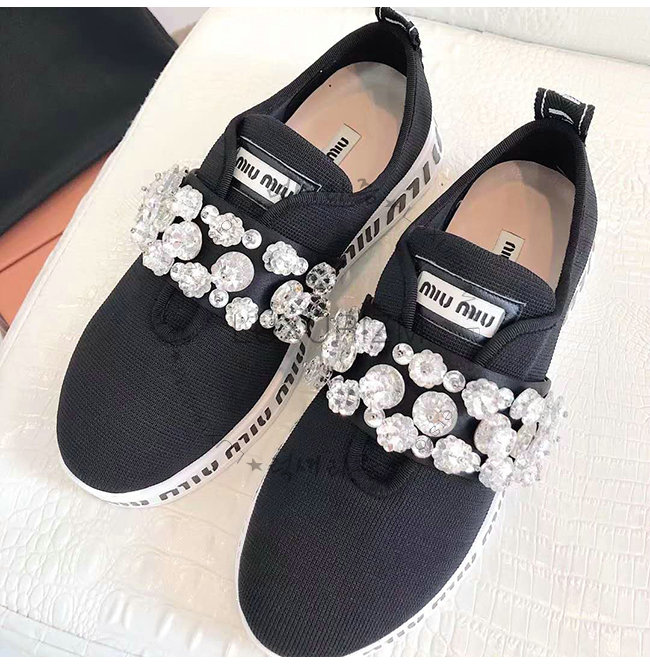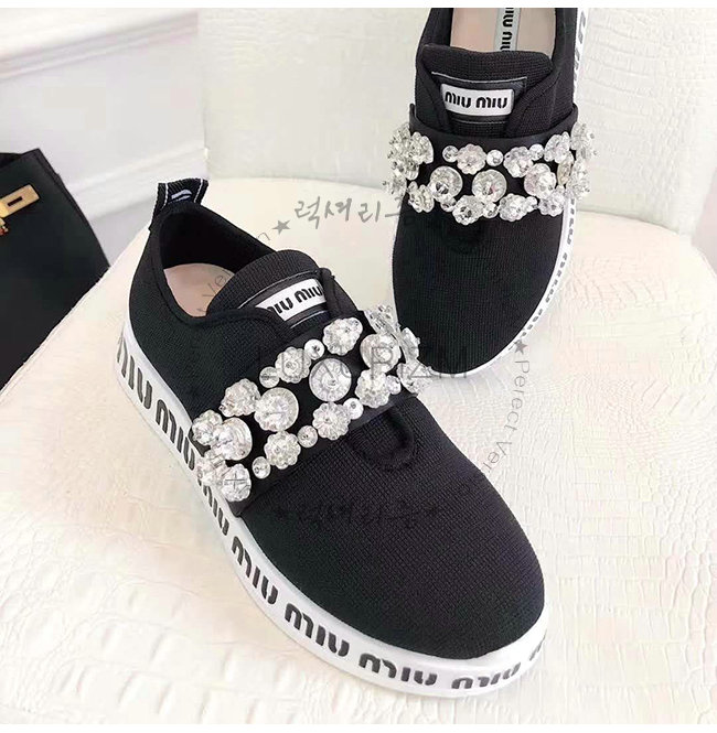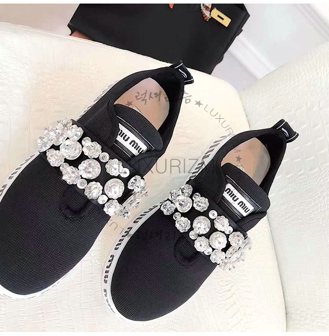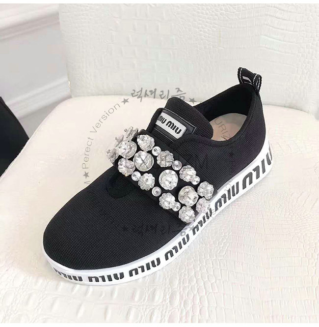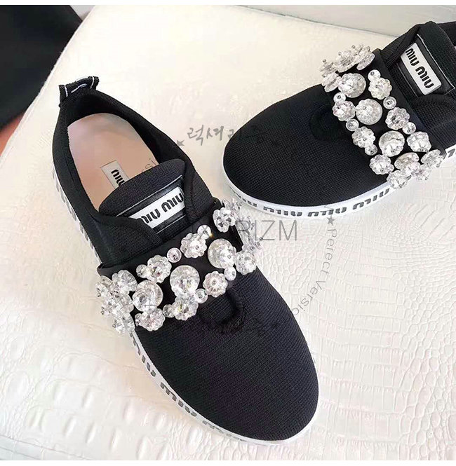 MIUMIU-5E015C 미우미우 스트레치 니트 크리스털 장식 블랙 슬립온 스니커즈