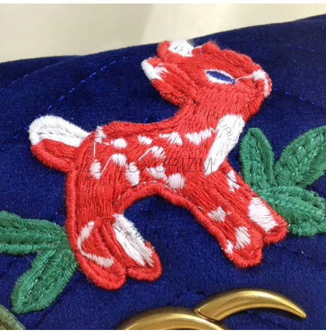 아플리케 장식.백 앞면을 장식하는 다채로운 꽃들에 둘러싸인 아기 사슴 자수 아플리케.구찌의
