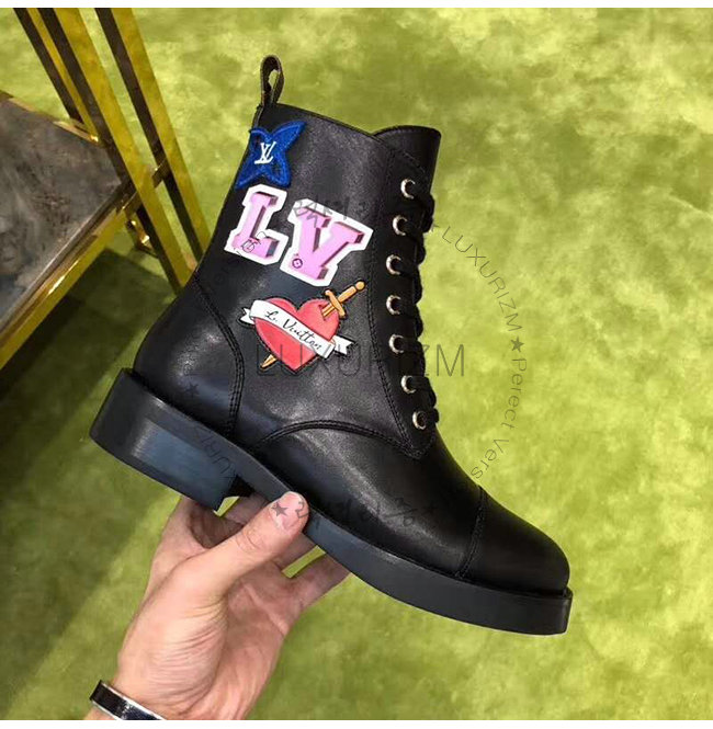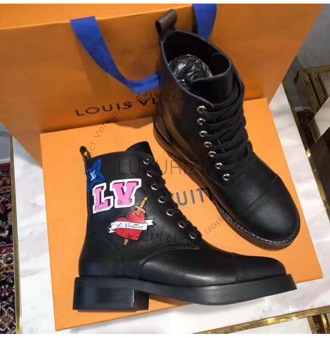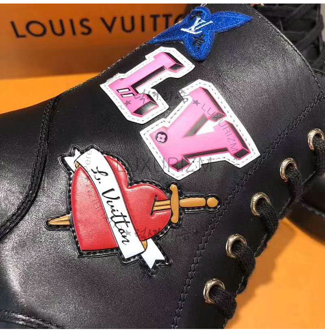 송아지 가죽의 LV 블랙 하트 플랫 레인저는 루이비통의 상징적 원더 랜드