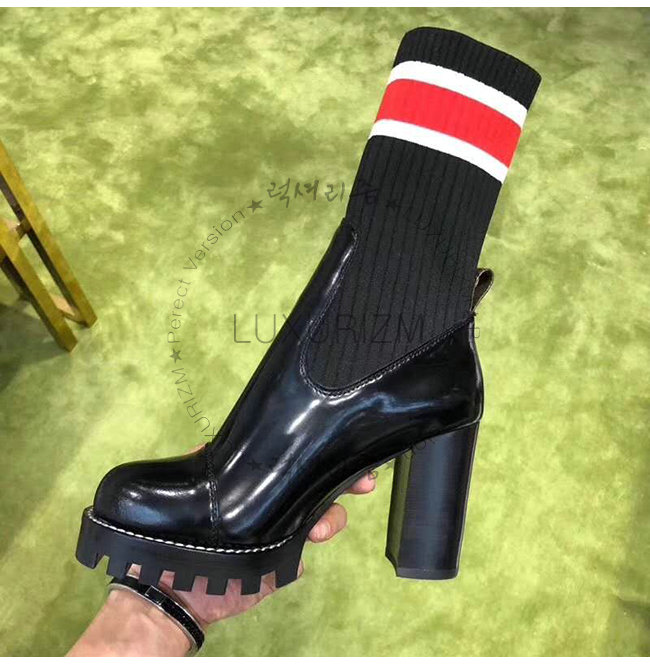 앵클 부츠입니다. 부츠 상단 부분을 과감한 레드와 화이트 컬러의 줄무늬와 LV 이니셜이 장식하고