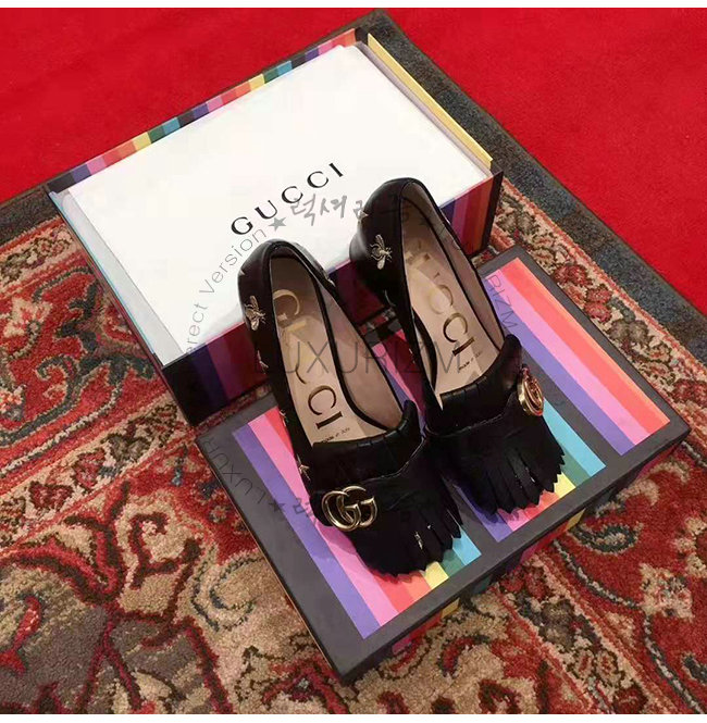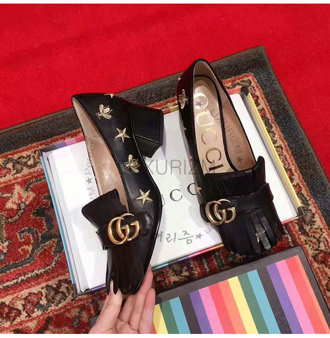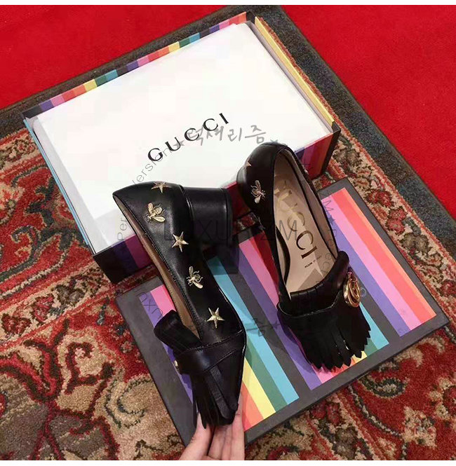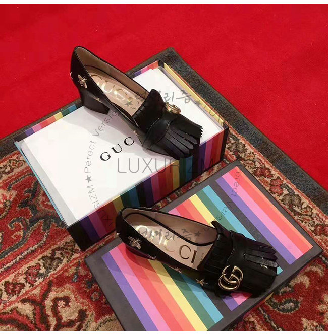 프린지 디테일의 펌프스. 다양한 구찌 하우스 코드의 조합으로 탄생한 경쾌한 디자인. 벌과