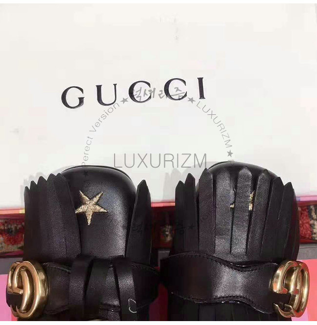 벌과 별 모양 골드 자수 장식의 가죽 폴드 오버 프린지 디테일 더블 G 55mm 힐.