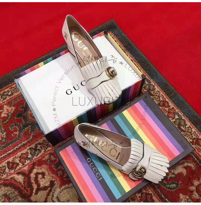 프린지 디테일의 펌프스. 다양한 구찌 하우스 코드의 조합으로 탄생한 경쾌한 디자인. 벌과