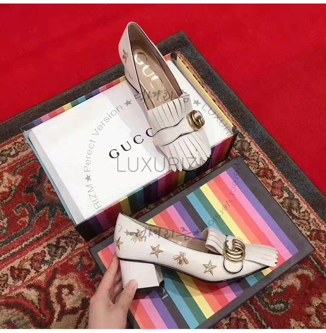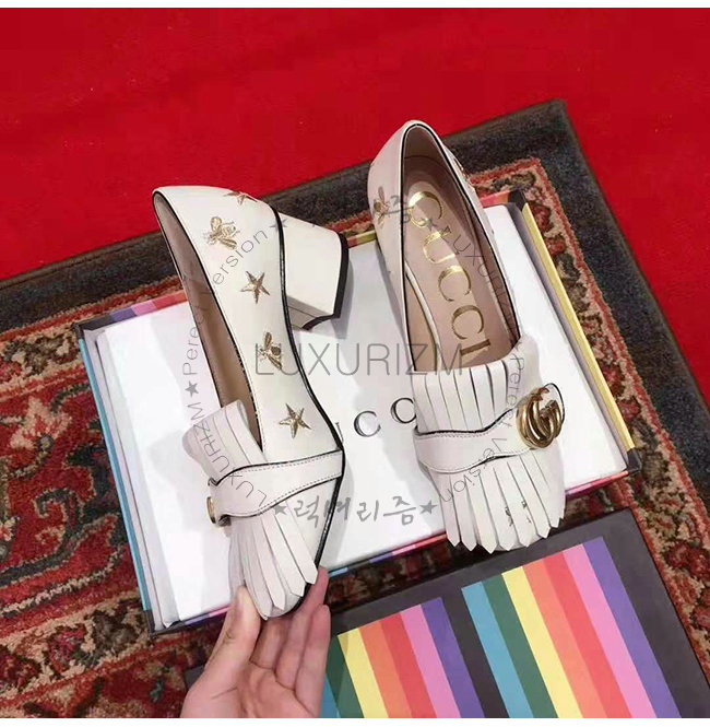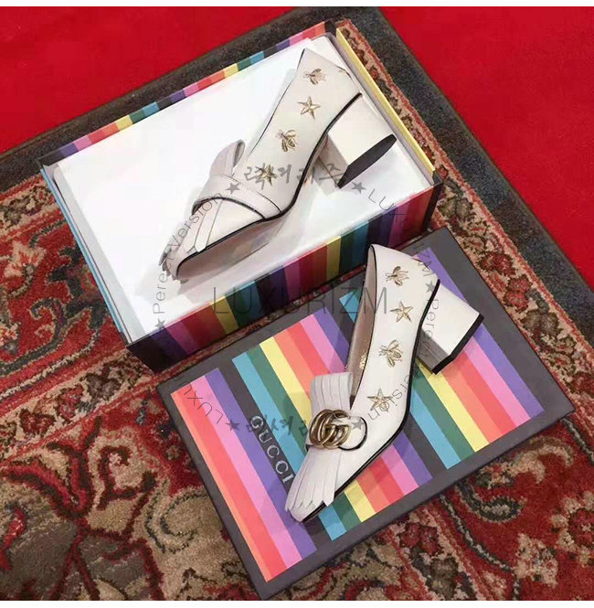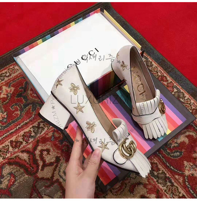 GUCCI-551548 9022 구찌 GG 마몽 화이트 가죽 자수 장식 미드힐 펌프스