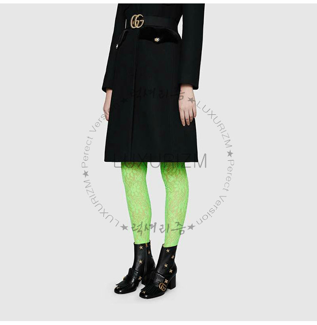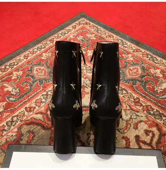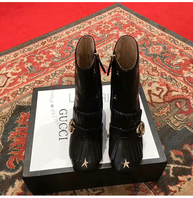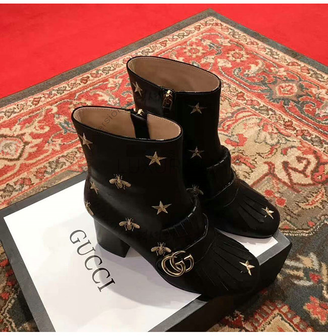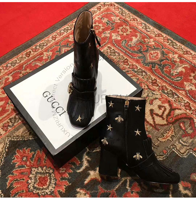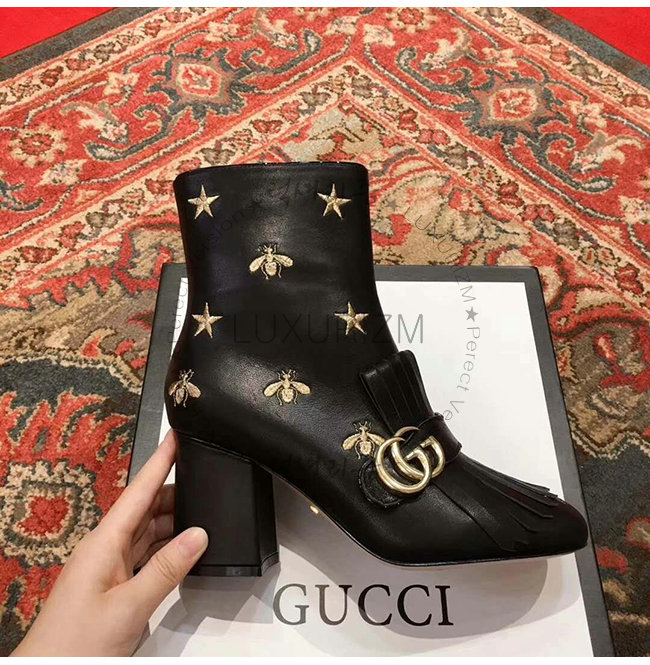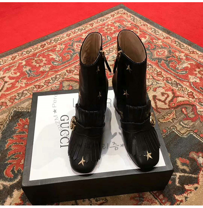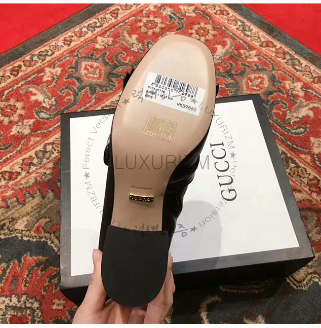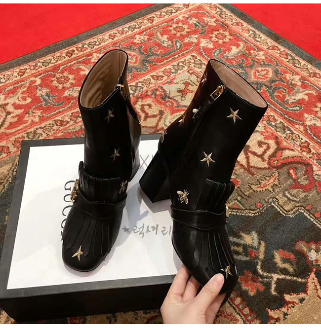 GUCCI-551545 1000 구찌 블랙 가죽 자수 장식 미드 힐 앵글 부츠