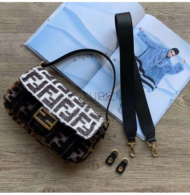 스트랩. 화이트 및 베이지 컬러 양가죽 소재.블랙 컬러의 매크로 FF 프린팅.탈부착 가능한
